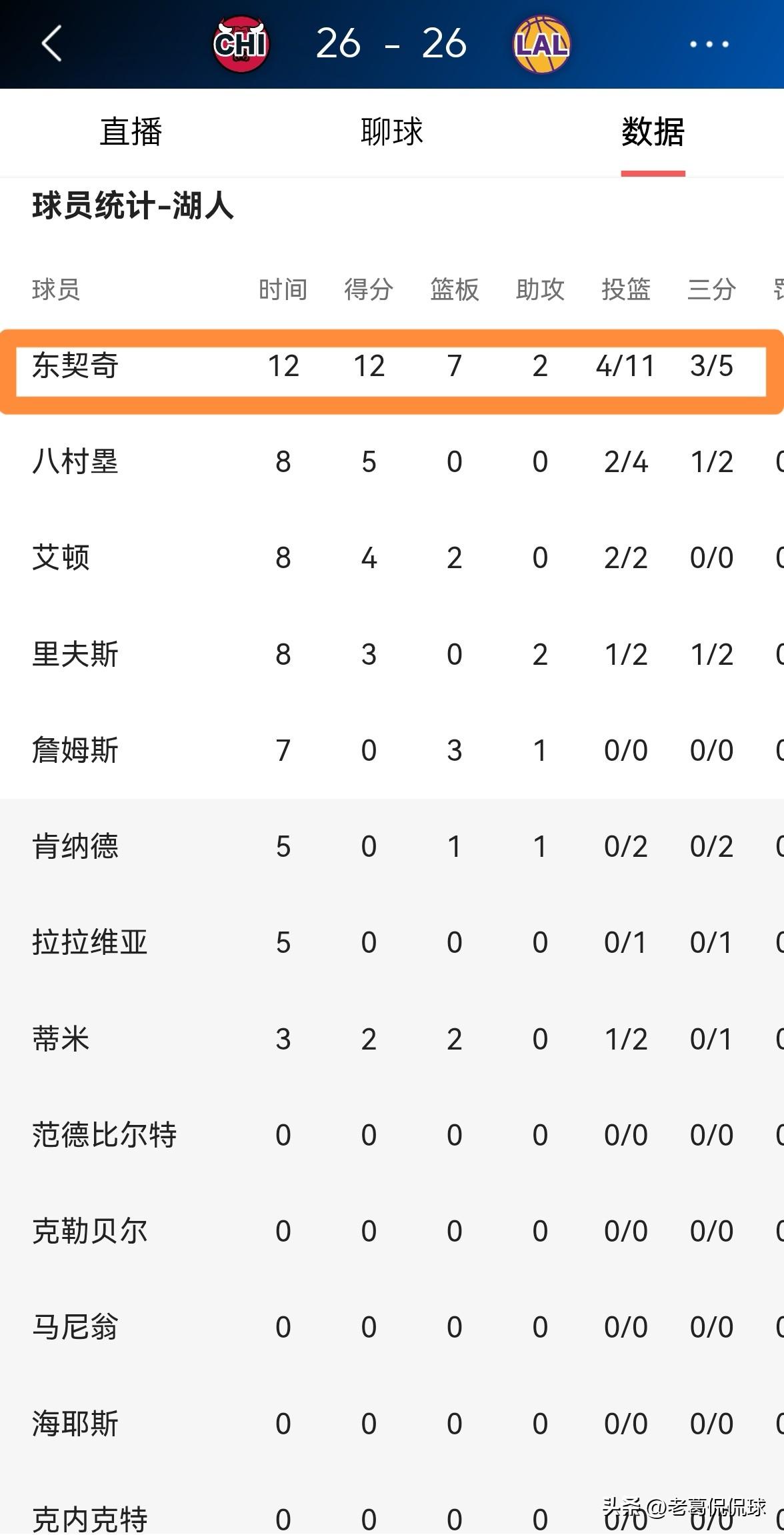 湖人巨星东契奇真是名副其实的篮球之耻!在今天湖人主场迎战弱旅公牛的比赛中,目前双方的首节比赛已经结束,湖人和公牛战成了26平。在第一节比赛中,东契奇从开场以后就展现出了极强的进攻欲望,他的眼里只有篮筐而没有队友,他在首发出战的12分钟里,投篮11中4,其中三分球5中3、罚球2中1得到12分7篮板2助攻。 作为湖人的当家球星,东契奇的眼里只有数据而没有队友,试问这样的数据刷子不是篮球之耻吗?
