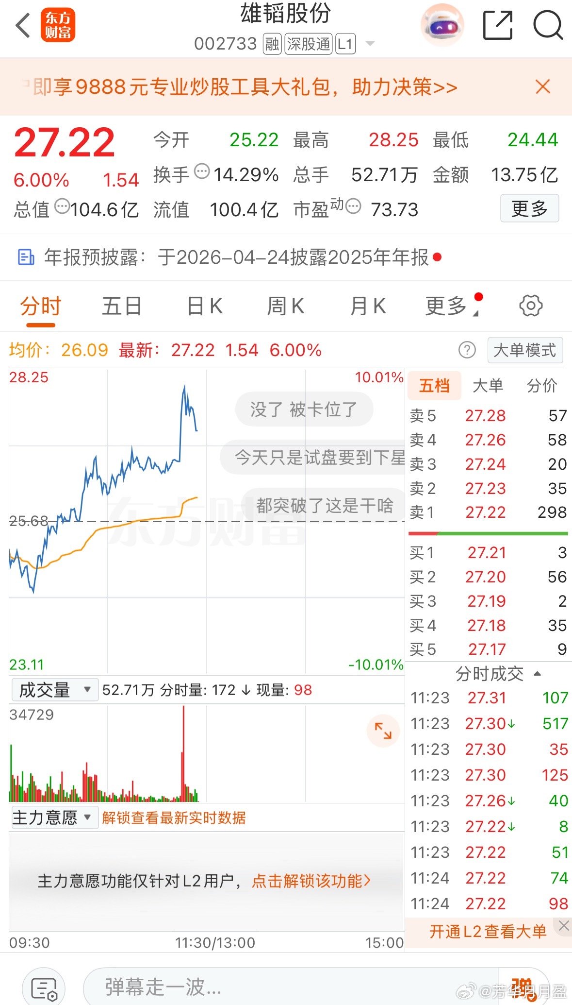 芳华短线账户昨天抄底的$雄韬股份 sz002733$ 今天立马大长腿,抄作业的爱粉隔天盈利已超10%,不知道怎么抄作业的宝子可以私信芳华!芳华剧本