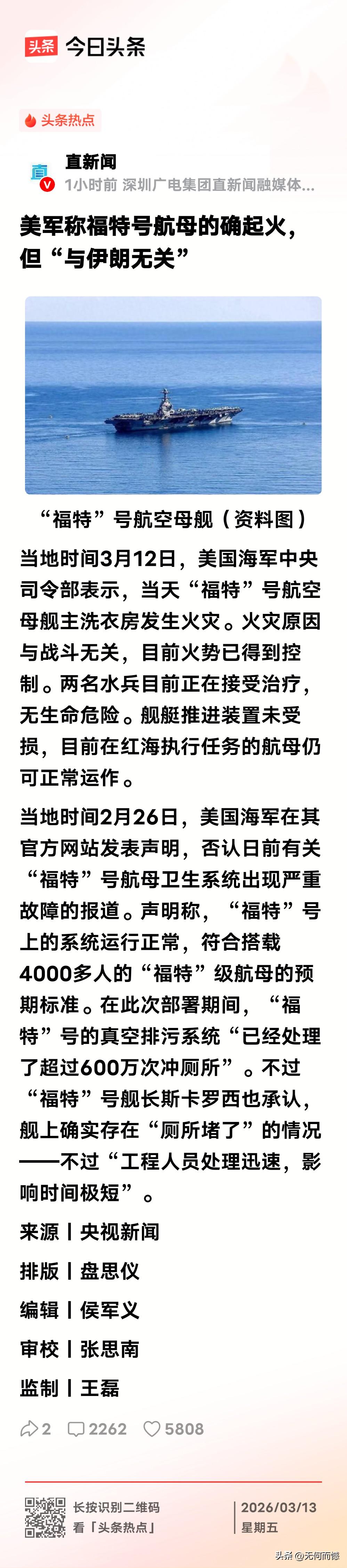福特号航母着火到底是以什么原因?到底是因为遇袭起火,还是主洗衣房着火,总之这艘航母事比较多,前段时间厕所被堵了,导致航母臭气熏天,这次又着火了,又整了个火光冲天,看来这艘航母命途多舛,多灾多难,就这次起火的原因,美方发布消息说是主洗衣房发生火灾,2人受伤,火势已得到控制,2名受伤的水兵正在接受治疗,没有生命危险。但是伊朗方面此前曾多次宣称对美国位于中东地区的航空母舰发起多轮导弹和无人机袭击。面对两种不同的消息,不得不让人多想,总觉得这艘航母起火起的太蹊跷了,坐不起火,晚不起火,偏偏在这个时候起火,确实有点搞不明白了,也不知道该相信谁了!