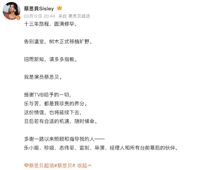 蔡思贝官宣离巢tvb蔡思贝宣布离巢tvb 12日晚,发文宣布离开TVB:“十三年