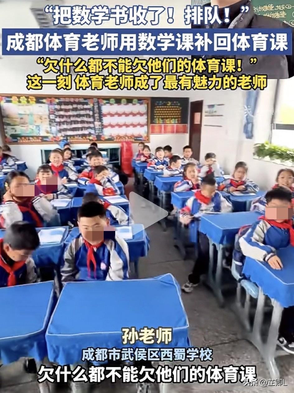 全网炸了!体育老师终于不再“体弱多病”,霸气抢回数学课:欠啥不能欠体育课!网友:建议全国推广! 最近成都一位体育老师火遍全网!一句“把数学书收了,排队!”直接让全班孩子欢呼尖叫,网友看完直呼:这才是童年该有的样子! 来自成都武侯区某学校的孙老师,之前因为请假耽误了孩子们一节体育课,一直记在心里。这回专门跑到教室,把课表排好的数学课“抢”过来,补上体育课! 老师一句“欠什么都不能欠他们的体育课”,瞬间戳中无数人,话题直接冲上热搜! 相信体育老师“体弱多病”是很多人的同款回忆:体育课常常被数学、英语老师霸占,成了名副其实的“副科牺牲品”。 但现在不一样了!体育老师终于硬气起来,理直气壮要回了属于孩子的运动时间,这背后藏着的是教育观念的大改变! 科学早就证明:运动能让大脑更灵活,提升专注力和记忆力,上体育课根本不耽误学习,反而能帮孩子减压、长身体、更加高效地学习! 以前大家总觉得体育不算分、不重要,为了成绩拼命挤占体育课。 结果就是孩子近视越来越早、镜片越来越厚、体重越来越重、体质越来越差,这都是用健康换分数的代价! 现在国家也在大力撑腰:体育法明确要求孩子每天锻炼1小时,体育中考分值不断提高。 2026年教育部还要严查占用体育课、不让孩子出教室的行为,坚决杜绝“阴阳课表”! 体育课的意义,远不止跑跑步、做做操那么简单。 跑长跑练毅力,踢足球学合作,参加比赛学会面对输赢,这些课本上学不到的能力,也是孩子一辈子的底气。 当然,光把课还回来还不够,大家更希望:体育课能真正上好,孩子能学到运动技能,而不是走个过场,更不要变成另一种为了考试的压力。 最好的教育,就是“文明其精神,野蛮其体魄”。 让孩子走出教室,跑起来、跳起来、流流汗,比多做一套卷子更珍贵、更重要! 网友纷纷留言:这样的体育老师,请全国推广! 素材来源:成都日报,侵联删!
