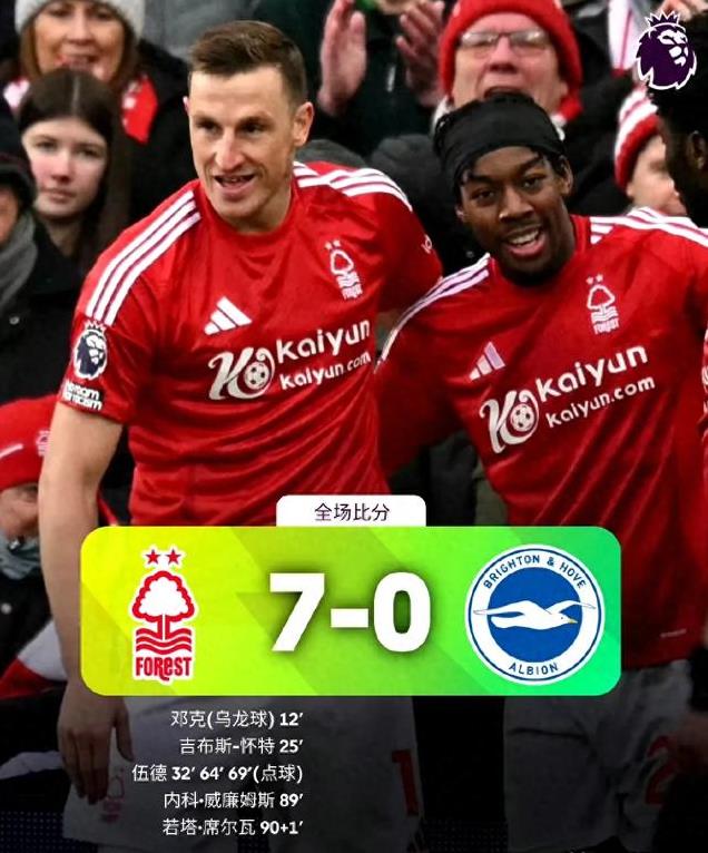 之后的比赛已经完全一边倒,最后20多分钟内,森林连入3球,本轮首场比赛就制造了惨案!第69分钟吉布斯-怀特造点,伍德主罚命中完成帽子戏法!第89分钟和90+1分钟,内科-威廉姆斯和若塔-席尔瓦分别建功,最终诺丁汉森林7-0大胜布莱顿!