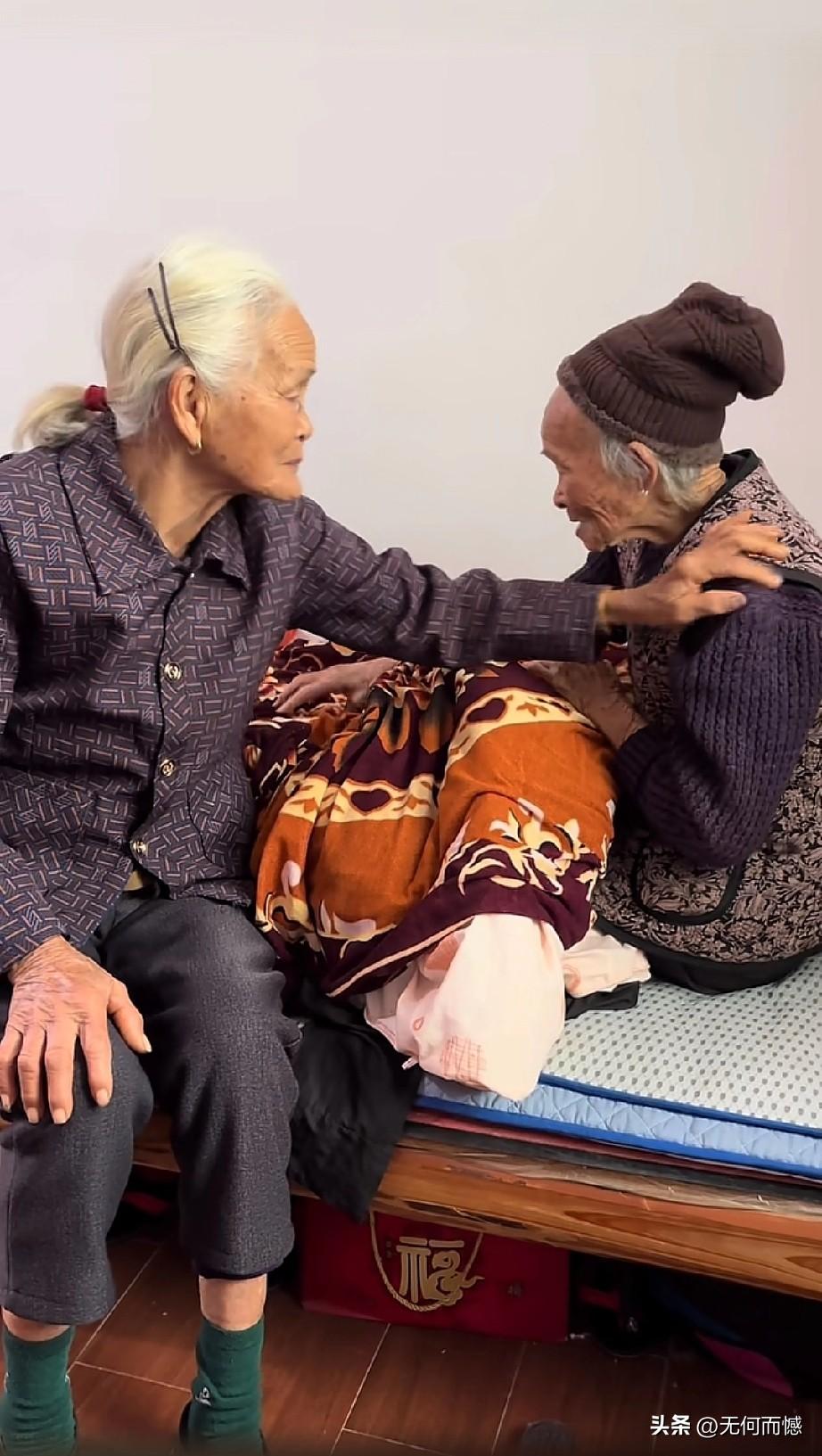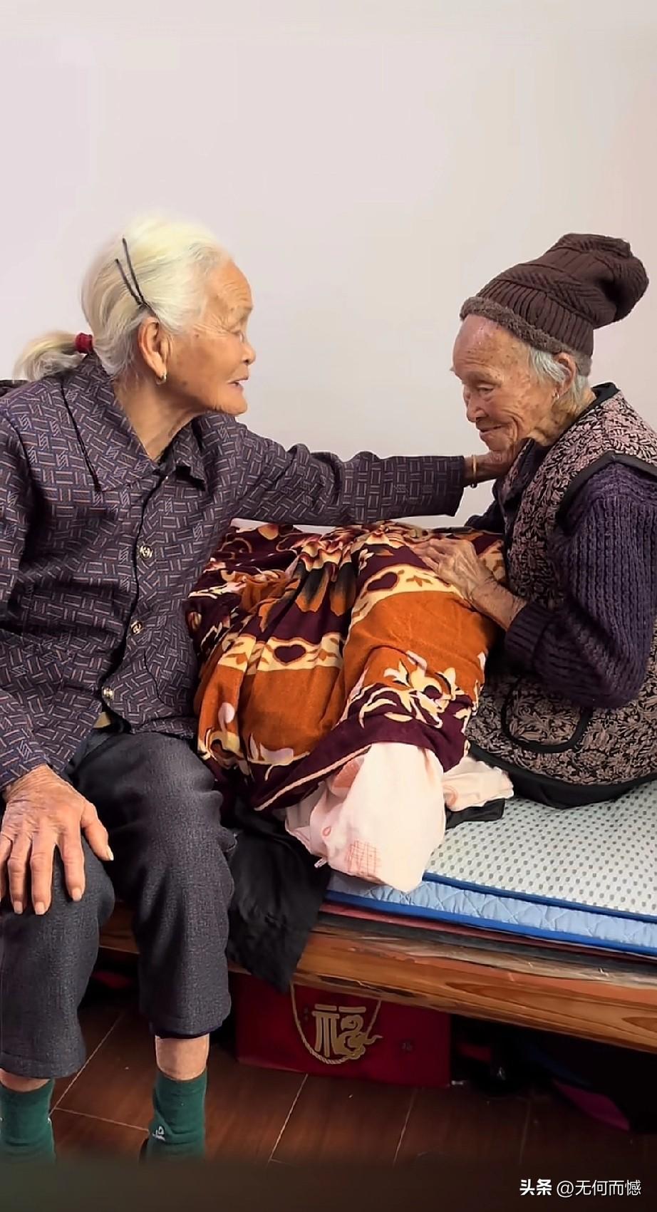 113岁的母亲和91岁的女儿聊天唠嗑,当听到女儿要回家时,母亲的心情好像不太开心,脸上的表情也变得沉默了,她很希望女儿待在自己的身边多唠一会儿,但是女儿也有家呀,也需要回家呀,娘儿俩都是老人了,老话说的好,老小孩儿,小小孩儿,家有一老,胜似一宝,我母亲要是在世的话,该多好啊!