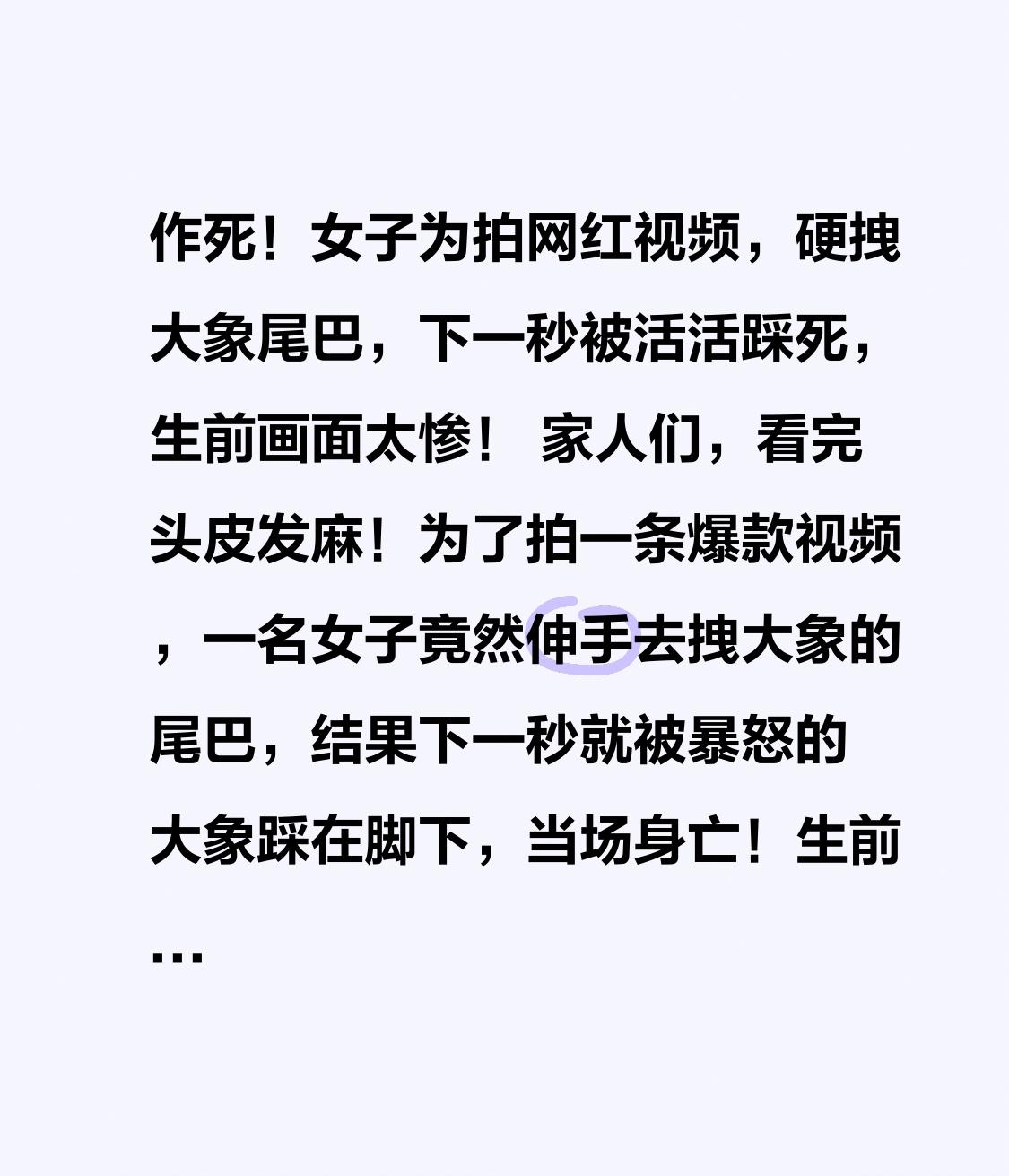 作死!女子为拍网红视频,硬拽大象尾巴,下一秒被活活踩死,生前画面太惨! 家人们,看完头皮发麻!为了拍一条爆款视频,一名女子竟然伸手去拽大象的尾巴,结果下一秒就被暴怒的大象踩在脚下,当场身亡!生前最后画面曝光,看完让人又惋惜又气愤! 事发在泰国某野生景区,这名女子和朋友一起游玩,看到大象在路边休息,为了博眼球、涨粉丝,她不顾景区“禁止靠近、禁止投喂”的警示牌,也不听朋友劝阻,直接冲过去,一把抓住大象的尾巴用力拉扯,还对着镜头大笑摆拍。 谁也没想到,这一拽,直接要了她的命!原本温顺的大象瞬间被激怒,猛地甩动鼻子,抬起粗壮的后腿,狠狠一脚踩在女子身上。整个过程不到3秒,女子连呼救的机会都没有,当场倒地不起,朋友吓得尖叫逃窜,现场惨不忍睹。 转折点来了!事后景区调取监控才发现,这头大象当天刚被游客反复骚扰,已经极度烦躁,女子这一拽,成了压垮骆驼的最后一根稻草。更让人无语的是,这已经不是第一次发生!为了拍网红视频,有人拽猴子、逗老虎、摸鳄鱼,多少人因为一时作死,付出了生命的代价! 有人说大象太凶,可动物本就有野性,人类的肆意挑衅,就是在拿命开玩笑。景区反复提醒,野生动物不可侵犯,可总有人心存侥幸,把无知当勇敢,把作死当个性。 生命只有一次,别为了流量,丢了性命!尊重自然,敬畏生命,才是最该守住的底线。 转发提醒身边人,别再拿生命博眼球,平安活着,比什么都重要!