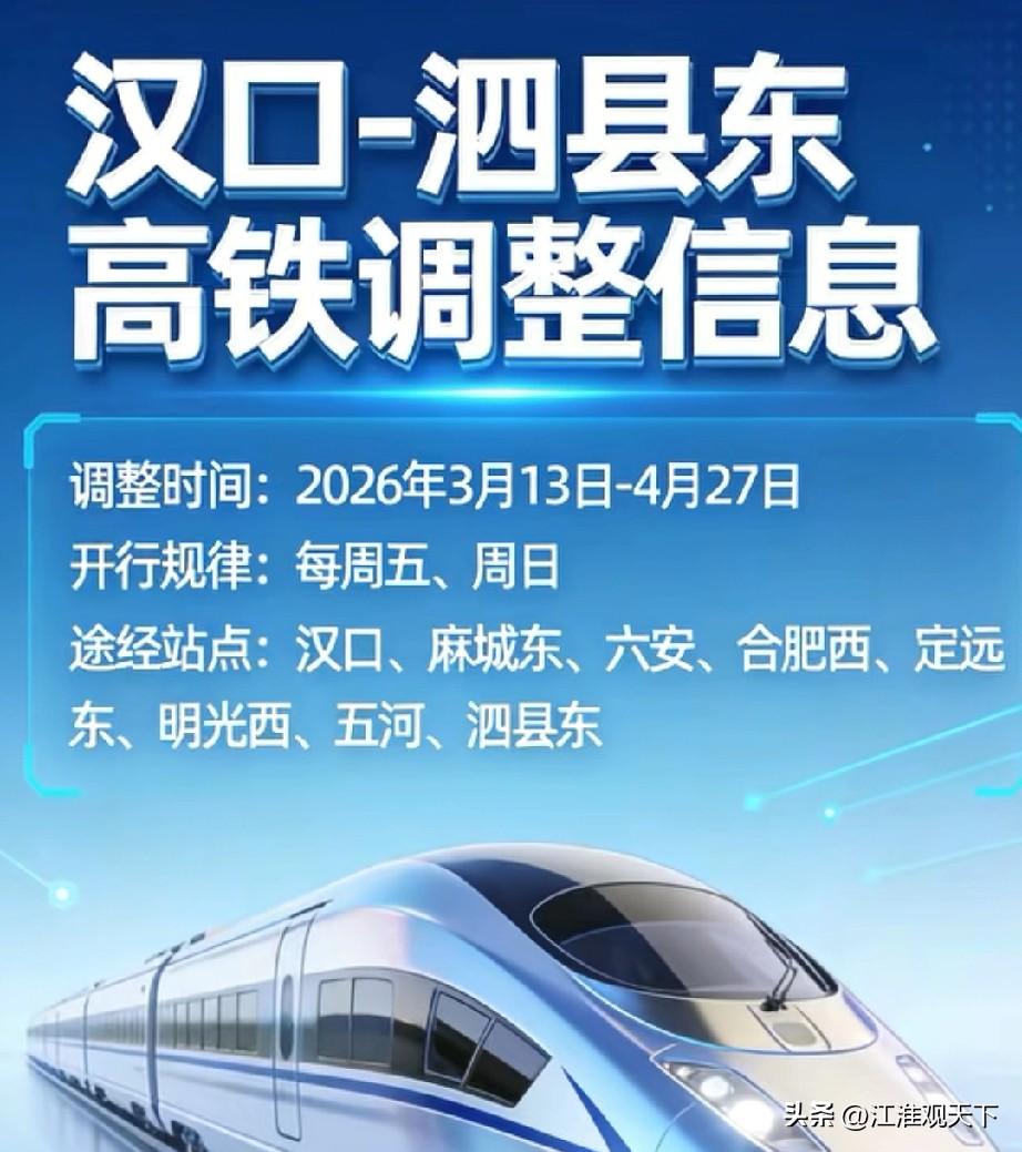 安徽泗县到湖北汉口的高铁后续只在周五,周日开行了,客流支撑不起来 高铁大大方便了老百姓的日常出行,但是高铁车次的增减也是不固定的,会有变化的,没有大客流支撑的线路,也只能保证最低运量,降低资源浪费。 2025年12月底开通的合新高铁合肥至泗县段,1月26号开通了跨路局车次,就是汉口至泗县,泗县至汉口的高铁班次。 春运结束后,在5.1劳动节之前,就是3月13号-4月27号这段时间里,汉口至泗县,泗县至汉口,只在每周五,周日开行,其它时间段不再开行列车。 高铁线路投资大,维护成本高,开行车次也需要客流量支撑,泗县至汉口段列车,对于泗县,五河,明光,定远4个县市老百姓来说挺方便的,其中的合肥至汉口段,本身沪汉蓉客专就是在公交化运营,车次非常多,沿线老百姓选择的车次也特别多。 在4月27号之前,泗县,五河,明光,定远的老乡们想去湖北武汉,尽量选择在合肥转车吧。宿淮蚌高铁 淮蚌高铁 皖北高铁站 大别山高铁站 皖北高铁大爆发 宿州回泗县 泗县高铁通车 合肥至襄阳高铁 安徽高铁发展史
