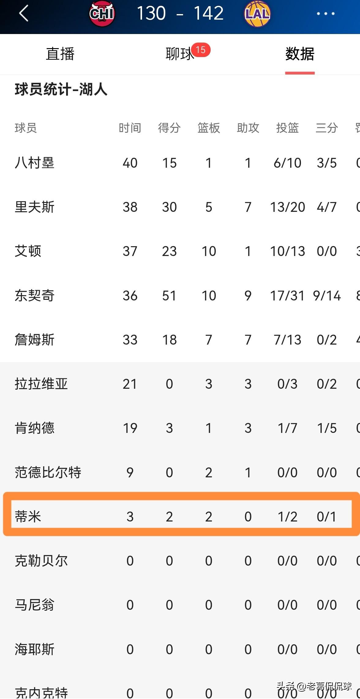 湖人大将蒂米的防守能力真是弱爆了!在今天湖人主场以142:130战胜公牛的比赛中,虽然蒂米在进攻端的表现还不错,但是由于他在防守端的表现过于糟糕,因此他仅仅得到了3分钟的上场时间,得到2分2篮板,他的场上正负值为-7。 坦白说,如果蒂米想要得到更多的上场时间,那么他必须提高自己的防守能力,不然的话他只能在球队里扮演打酱油的角色。