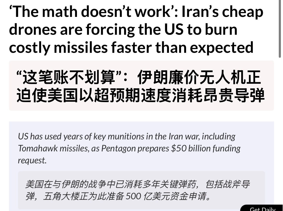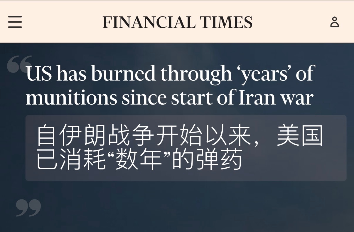 🔻《金融时报》:打伊朗已经把美国几年的弹药储备都打出去了。🔻《politico》:欧洲和亚洲的美国盟友担心五角大楼的弹药消耗速度过快,导致无法提供他们已购买的武器。🔻考虑到金融时报的日经背景,细细体会一下美国在伊朗打的焦头烂额同时还在伤害谁。🔻这是好事啊。伊朗称若电力遭袭整个地区将陷黑暗美军一加油机坠毁据称非被击落海外新鲜事中东现场直击