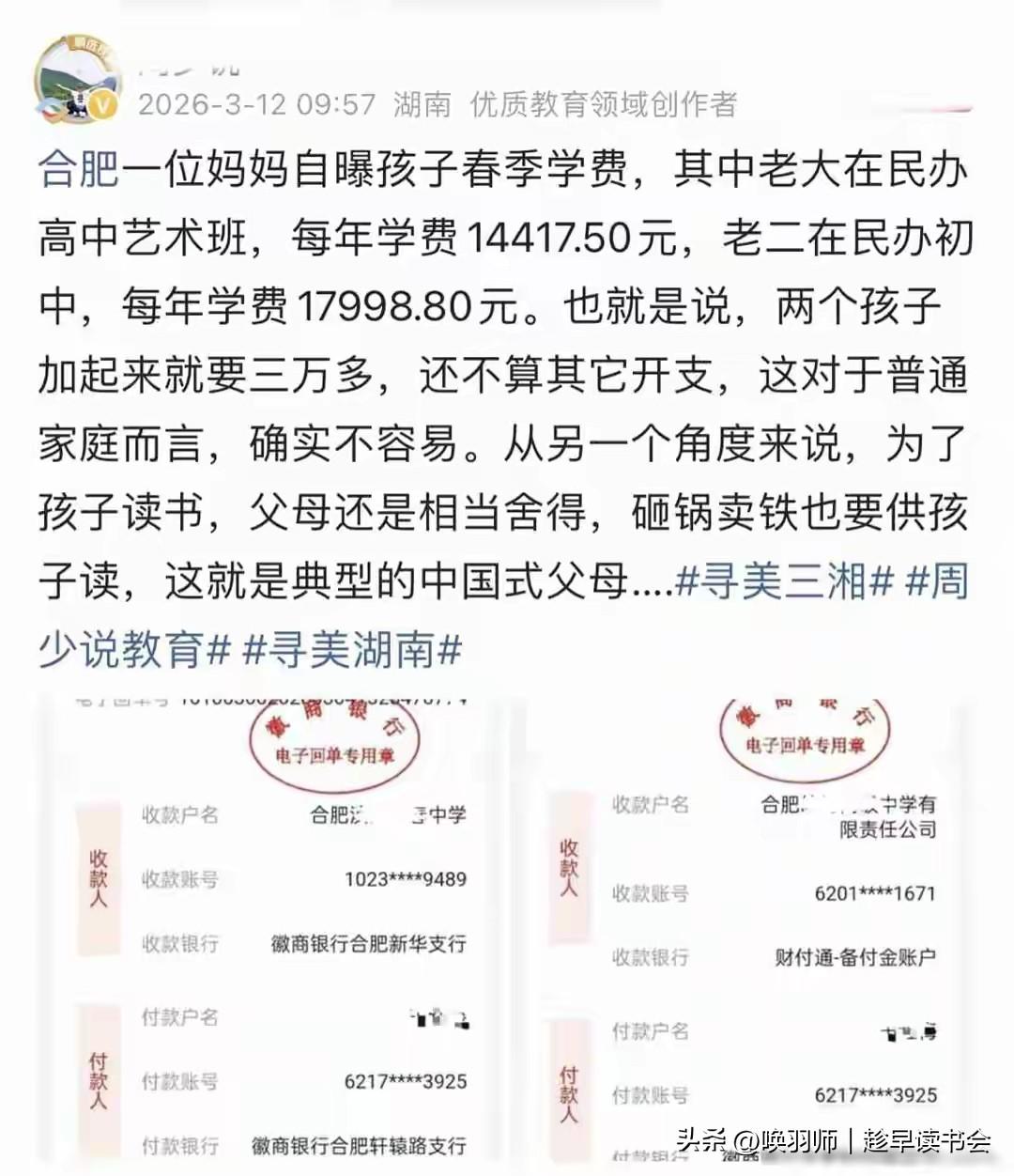 合肥妈妈晒出三万二学费单,评论区炸了:比房贷压力还大 2026年3月12日,合肥一位宝妈晒出两张缴费单:大儿子民办高中艺术班14417.5元,小儿子民办初中17998.8元,合计超三万二 。 这不是个例。过去三年,合肥民办中学学费年均上涨8%-12%。艺术班收费最高,可大多数学生最后仍回普通高考赛道,被媒体质疑是“换个名字的分流办法” 。 政策漏洞值得关注:教育部规定民办义务教育占比不超5%,但未管住学费上限。学校将费用拆成服务费、材料费、研学费,账单越来越厚 。 对比北京海淀、上海浦东的集团化办学、教师轮岗,合肥民办仍靠掐尖招生维持“好学校=贵学校”的认知 。 唤羽师观点: 《孟子》云“鱼与熊掌不可兼得”,家长愿为孩子舍鱼取掌。但当教育异化为“焦虑税”,最该追问的是:三万二买的究竟是孩子的未来,还是成年人的幻觉?普高学校学费 合肥高三补习班 安徽本科学费 合肥学厨学费 家长群收费 公办费用 高中学校价格 合肥小明的家长 南昌高中学费 淮中学费 南昌学校学费 合肥学车费用 学费价目表 合肥公办职高 合肥学厨师学费