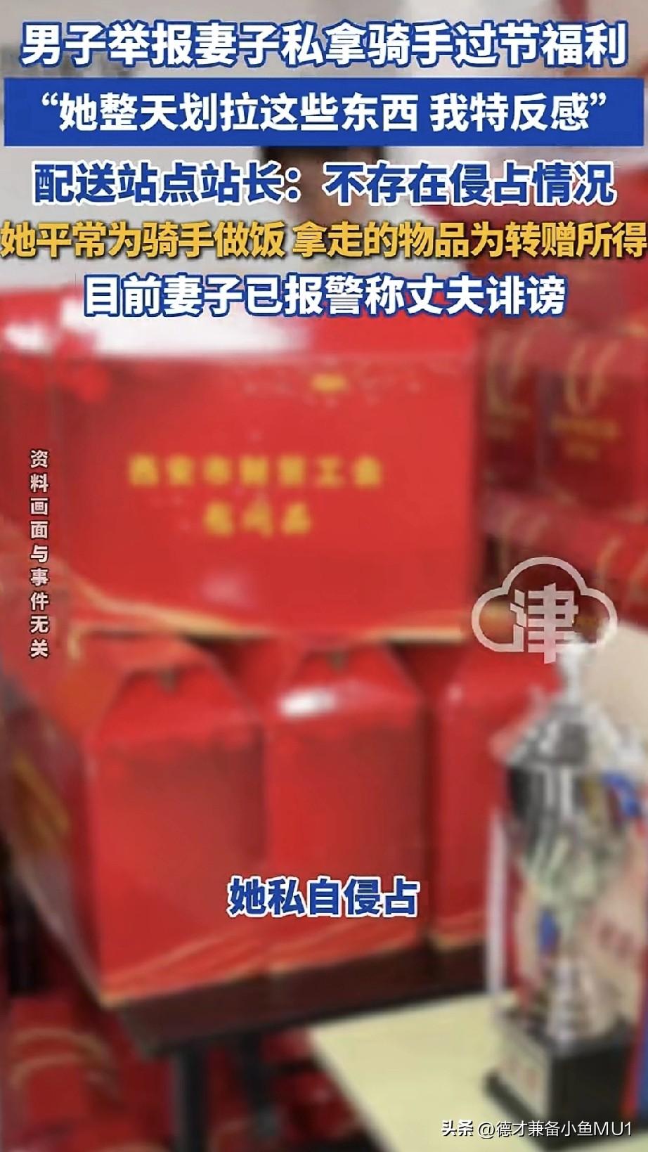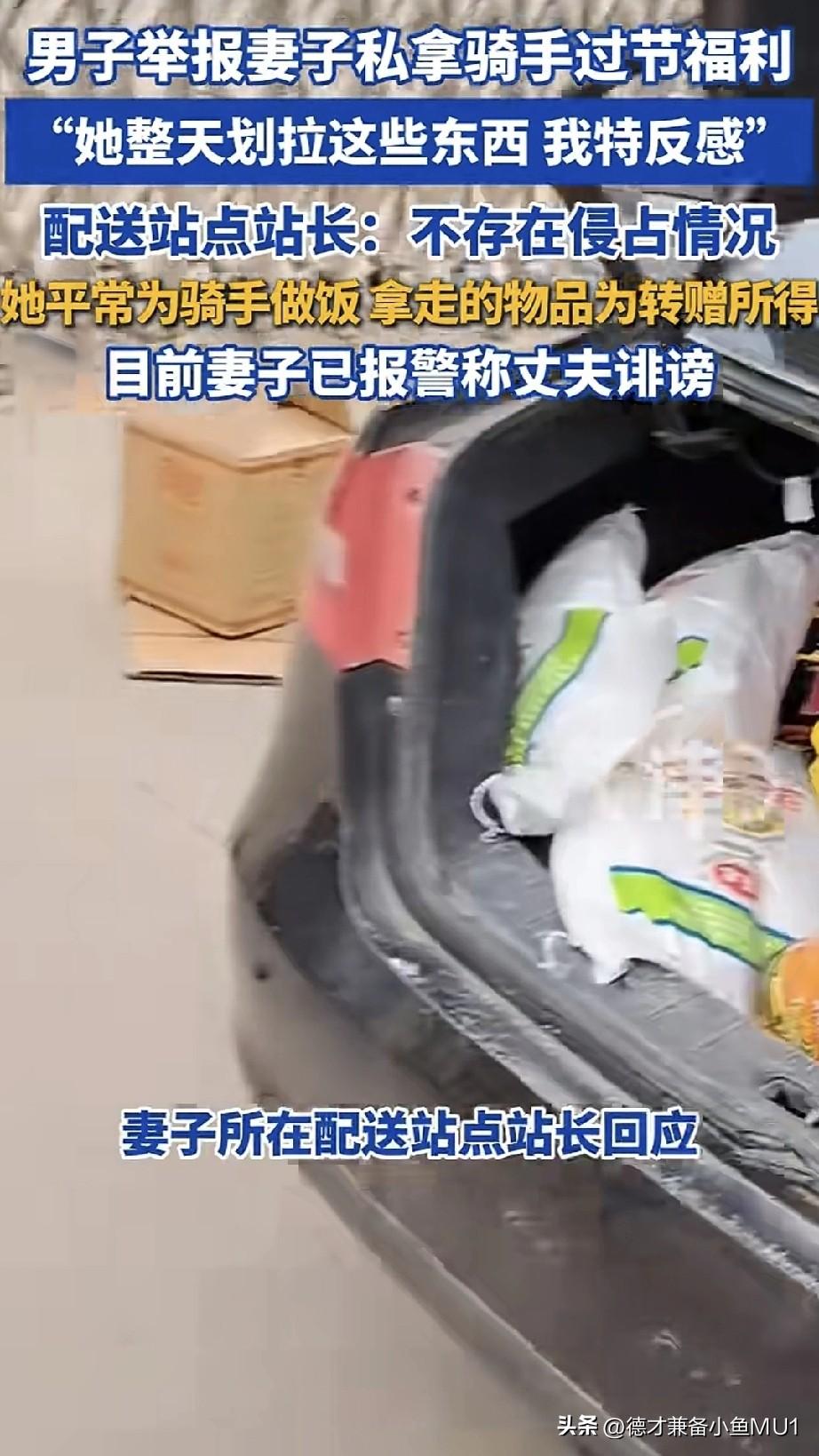 男子举报自己的妻子私自拿骑手的过节福利,他对妻子总往家里弄这些礼品十分反感。 原来,男子的妻子是一个配送站的副站长。男子举报称,春节期间,妻子拿回了16桶桶装油、8袋米和8袋面,还表示以前在端午、中秋等节假日,妻子也会把礼品拿回家。然而,该配送站的站长出面回应称,不存在侵占情况,平时她在站点会给骑手做饭,拿走的物品都是骑手转赠的。男子的妻子已报警,称丈夫诬陷自己,两人存在家庭矛盾。 有人相信女子是清白的,毕竟是骑手转赠的。有些年轻的单身骑手,发米面油对他们来说没什么用,他们都不做饭,送给会做饭的副站长很正常。 这看似大义灭亲,实则是有私人恩怨,真是一对欢喜冤家。 但也有网友怀疑女子就是拿了骑手的福利。每年逢年过节给骑手发米面油,除了和领导关系好的,80%以上的骑手根本拿不到,有网友称自己干了5年,各个平台都做过,对此多少有些了解。 对此,大家怎么看?