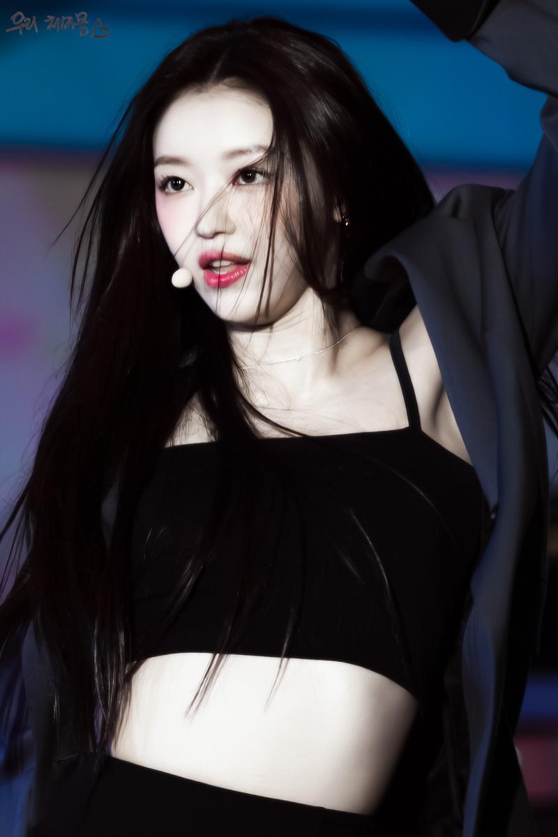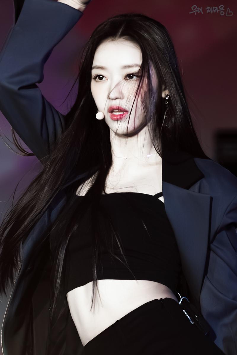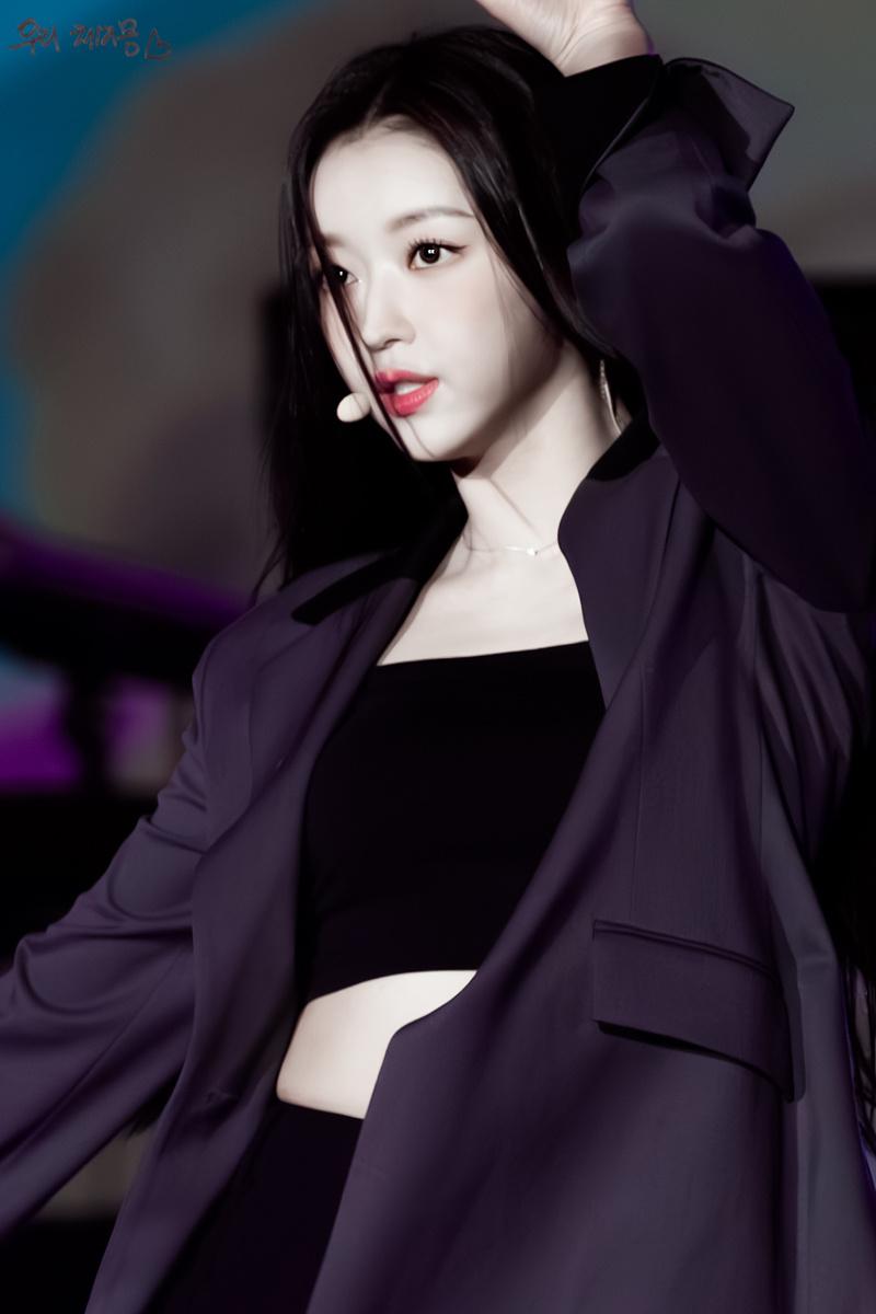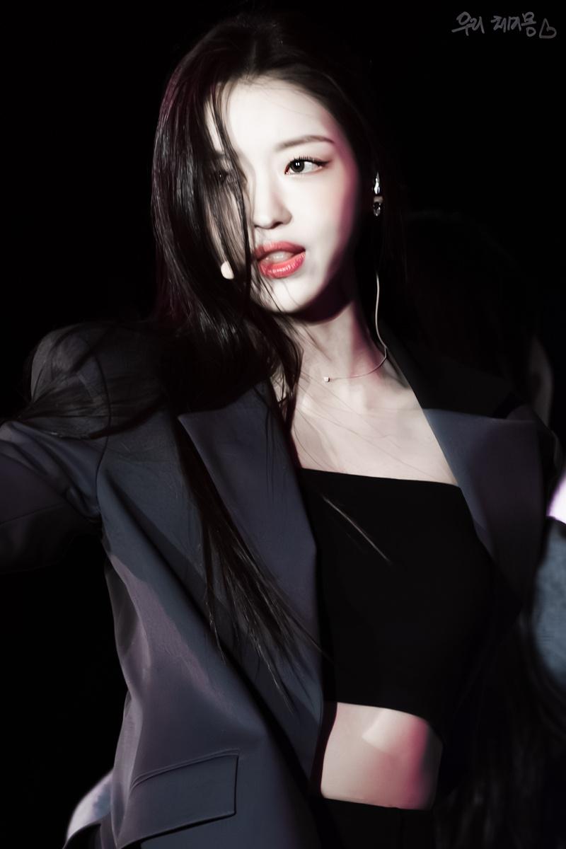 冷艳黑色西装搭配黑丝长发魅惑,尽显舞台上的女王风范。
