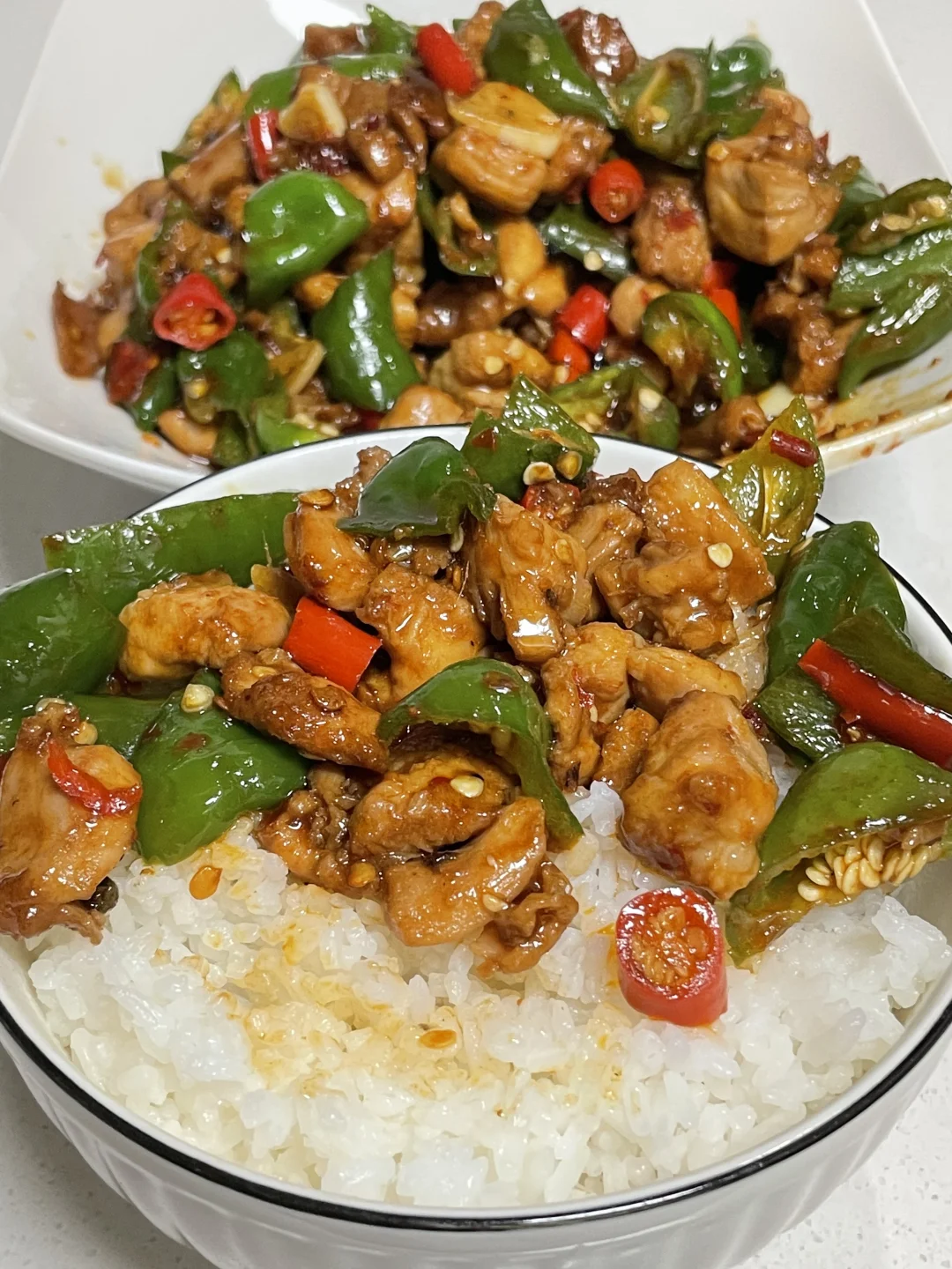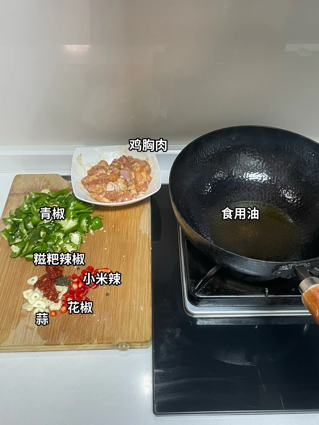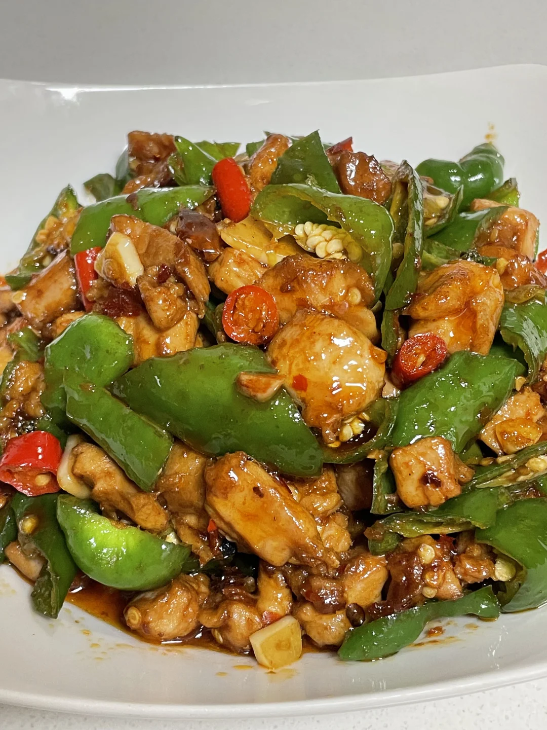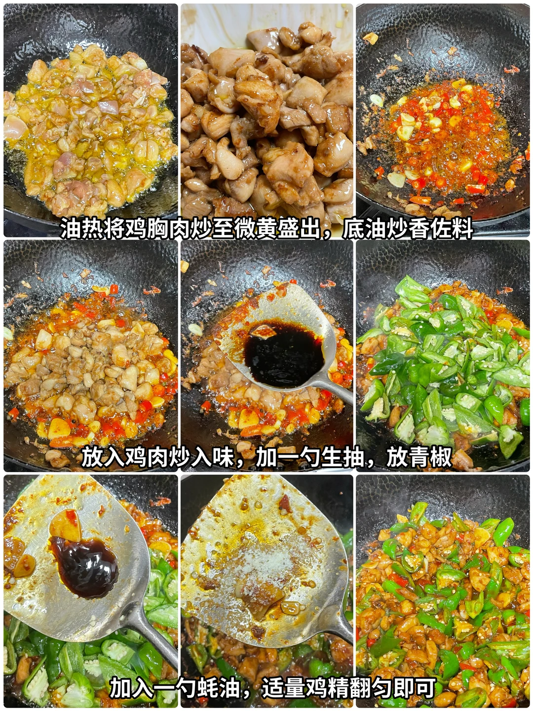 3⃣️起锅烧油,油热,将鸡腿肉煸至微黄盛出,锅里的底油炒香,小米辣,花椒,蒜,糍粑辣辣椒,然后放入鸡胸肉翻匀炒入味,加入1勺生抽翻匀,放入青椒,加入1勺蚝油,适量的鸡精,将青椒炒断生,翻匀即可出锅。这样做出来的小炒鸡腿肉又入味又嫩滑且巨下饭,喜欢的姐妹可以尝试着做一下。
