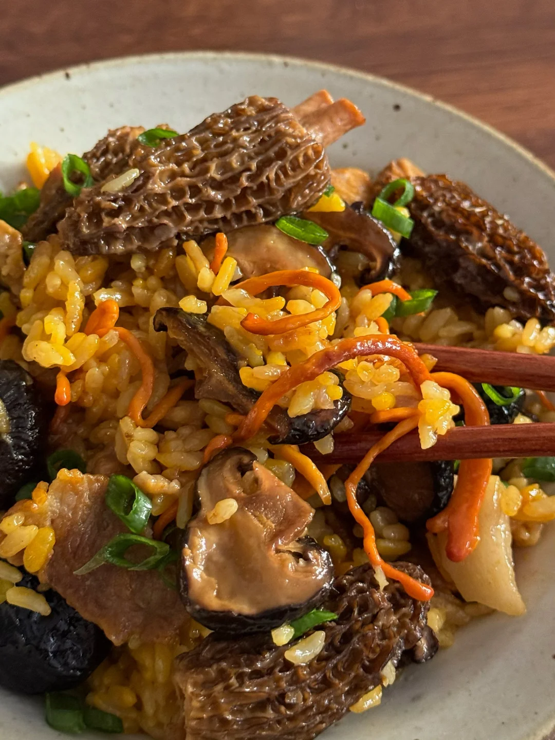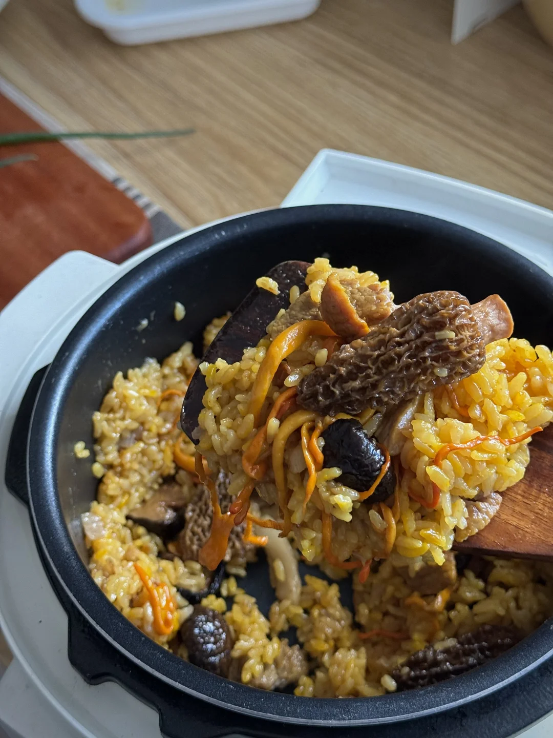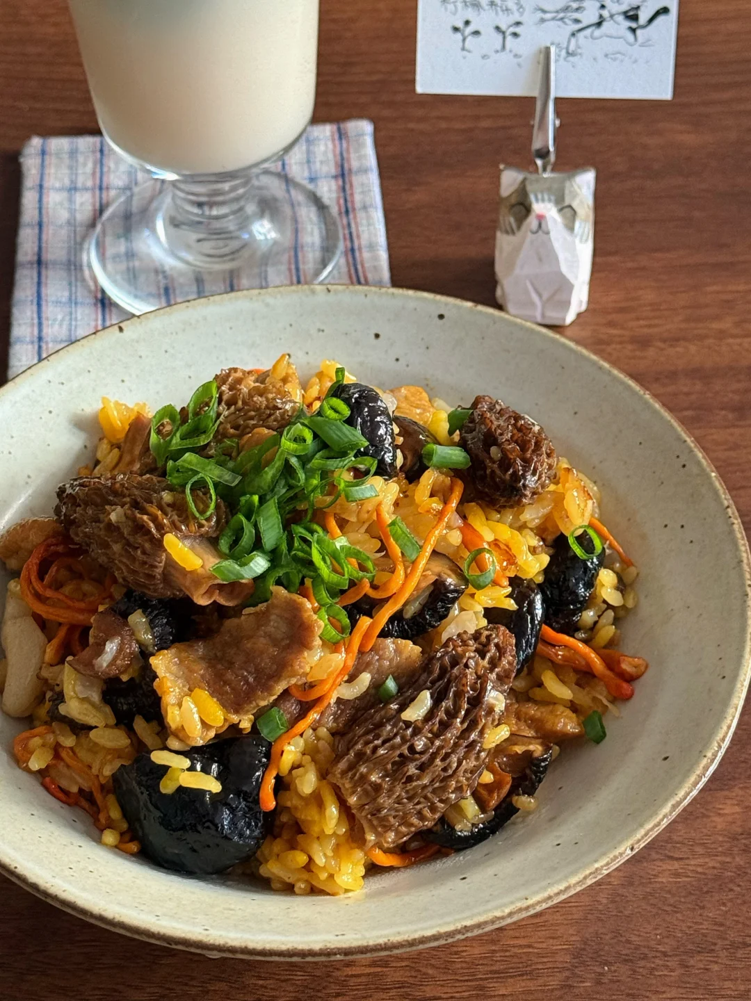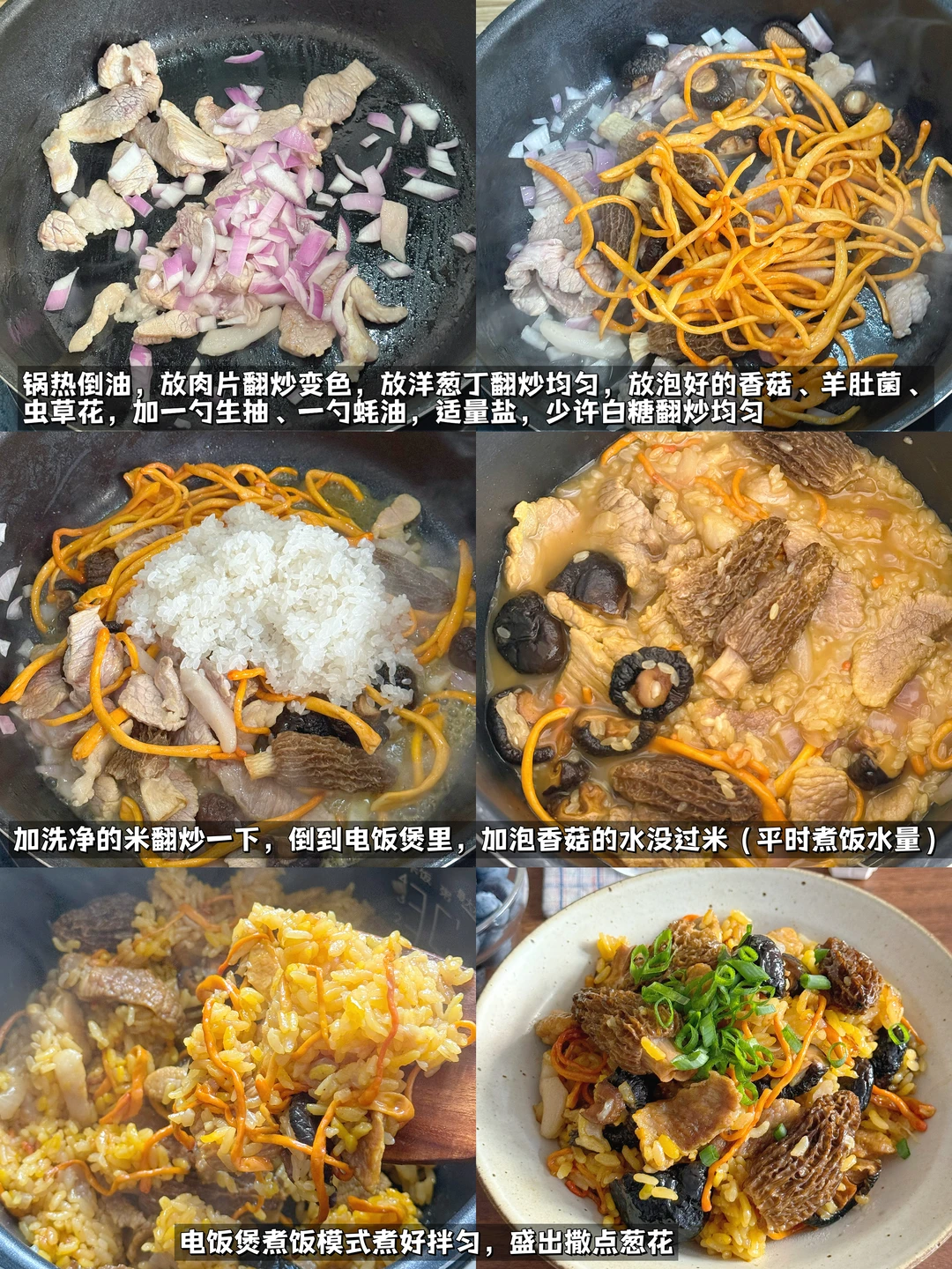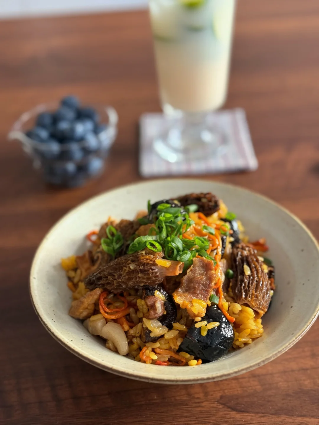 午餐分享:羊肚菌猪肉焖饭,青柠养乐多,蓝莓 🌼今日光线甚好,饭拍出来也格外的漂亮! 在纠结干菌和鲜菌🍄🟫之间选择了干菌,味道更浓郁,喜欢更脆嫩口感的宝子换鲜菌也完全ok👌! 喜欢懒人一锅焖,各种料炒一炒往电饭煲里倒,按煮饭键就行!(小tips:猪肉用五花更香,炒出些油脂再倒出些油脂,我这用差不多纯瘦肉) 煮好后粒粒分明,因为加了虫草花,饭粒染上了好看的金黄色,油光锃亮✨,菌香扑鼻! 再来一杯冰爽柠檬养乐多🍋,配着爆汁蓝莓🫐, 是今日神仙组合一餐啊!