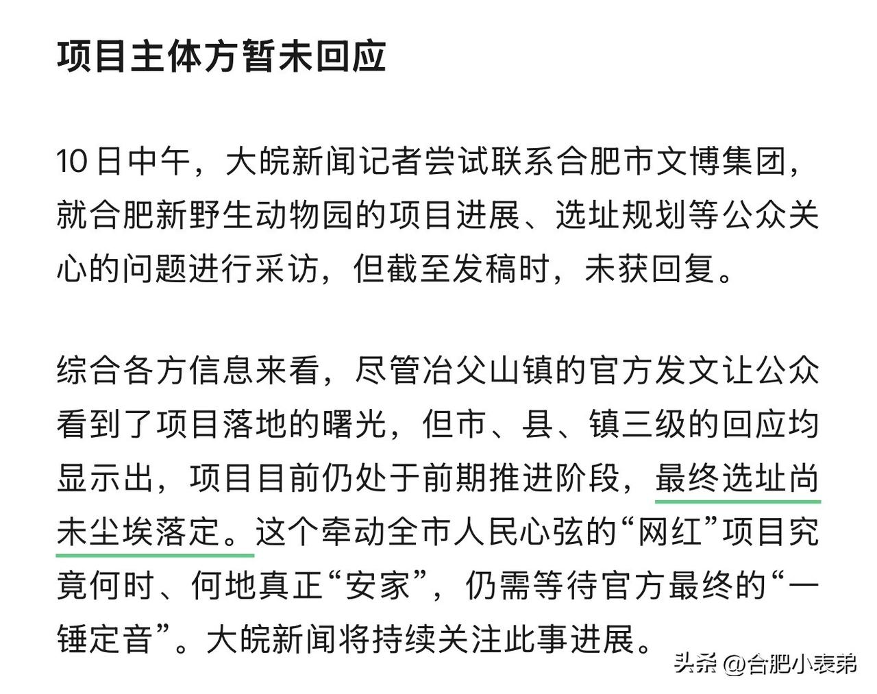 合肥新动物园 别炒了,真看累了[允悲] 23年就官宣肥东泉山,到现在一铲子没动。 当年嫌肥东40公里,远。现在吹庐江80公里,合理? 居然还有博主吹庐江是度假村+温泉=银基? 这应该是南京汤山同款呀!吹都吹不对[允悲] 但是汤山有地铁有奥莱托底,我们建成后拿什么比? 大皖新闻最新求证:庐江根本没官方实锤…… 拖拖拉拉,真落地估计至少5年起, 况且还没有确定好位置…… 合肥新动物园和冰雪世界, 全是炒作,再也不期待了。[微笑]