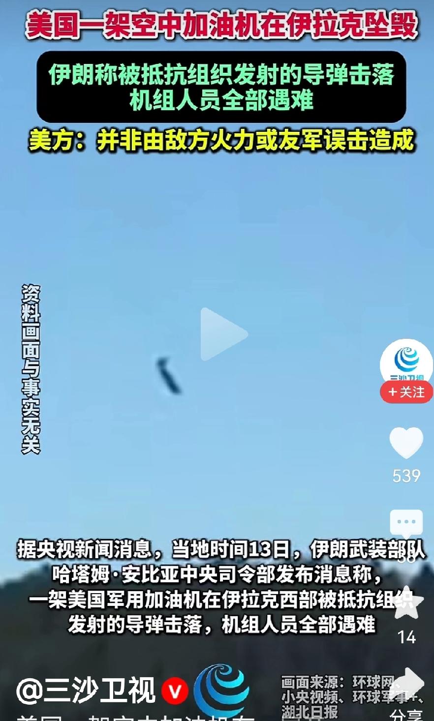 伊朗击落一架美空加油机 3月13日伊朗军方称在与伊拉克边境附近击落一架美军空中加油机,机组人员全部随机坠亡。 美伊两方说法不一,伊朗军方称,是被伊朗的地面导弹击中而坠毁的。 而美军方称,一架美军空中加油机不是伊朗导弹击中而坠毁的。而美军重点强调,并非敌方火力或已方火力而为。