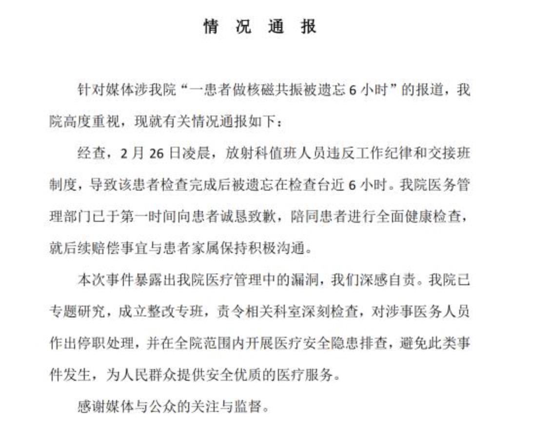 患者凌晨去医院做核磁共振检查,竟然被困在检查床上6个小时,事后涉事医生只是被停职,这样的处罚是否轻了点? 在今年2月26日凌晨0点左右时,湖北武汉的唐先生,在当地同济医院核磁共振,负责的医生因为着急做其他事情,所以就在系统上标记检查已完成,交代接班的同事检查床上有人就离开了,而接班的同事后来就忘了这茬,结果就导致唐先生被困在检查床上6个小时,最后是保洁发现唐先生才获救。事后医院承认自己错误,将涉事的两名医生停职处理,但却认为对唐先生伤害不太大,唐先生索赔有点高,所以双方没能谈拢,他们让唐先生走法律途径。 那如何看待这起事件呢?我是觉得涉事医院太荒唐而且也太傲慢了一点。首先,能把患者困在检查床上6个小时,这样的低级错误是前无古人后无来者,更是闻所未闻见所未见,毫不夸张地讲,这简直是划时代的事情。而这样的低级错误,只要稍微用点心,都是可以避免的,可到最后为何没能避免?不仅仅是他们工作流程出了问题,更是他们对患者漠视的一种体现。如果躺在检查床上的是医生的亲人,还会有这样的奇葩事情发生吗?肯定不会的!所以重视与不重视,关心与不关心,通过这件小事就能体现出来。 其次,大家注意一点,这个唐先生不是简单意义的躺在床上,而是他的头部被固定,脸部被罩子给罩住,耳旁一直传来机器的轰鸣声,而且这样的状态不是持续了十分钟,而是持续了整整6个小时,他是叫天不不应叫地地不灵。虽然在检查床上躺6个小时,对他的身体没有太大的伤害,但对于心理的伤害却是不可估量的。如果换做是一位有幽闭恐惧症的人,医生不负责任的做法几乎就是致命性的。可这些伤害在涉事医院的医生眼中,竟然是不太严重。难道是只有出了人命才算严重吗? 最后,面对如此低级,对患者伤害巨大的错误,医院只是对涉事医生停职处理,要知道所谓的停职只是暂时性措施,说不好听点对于医生来说,不过就相当于休假而已。所以我个人是觉得,这样的处罚真的是太轻了,而且不足以让他们吸取教训。另外医院为何敢于让患者起诉?说白了无非是因为,他们医院是有专业的律师团队,而且一般类似的纠纷,由于涉及到专业性问题,患者很难讨到便宜,并且法律途径来维权旷日持久,对患者来说是极为不利的,所以医院这边才有恃无恐。这何尝不是一种对患者的欺负?