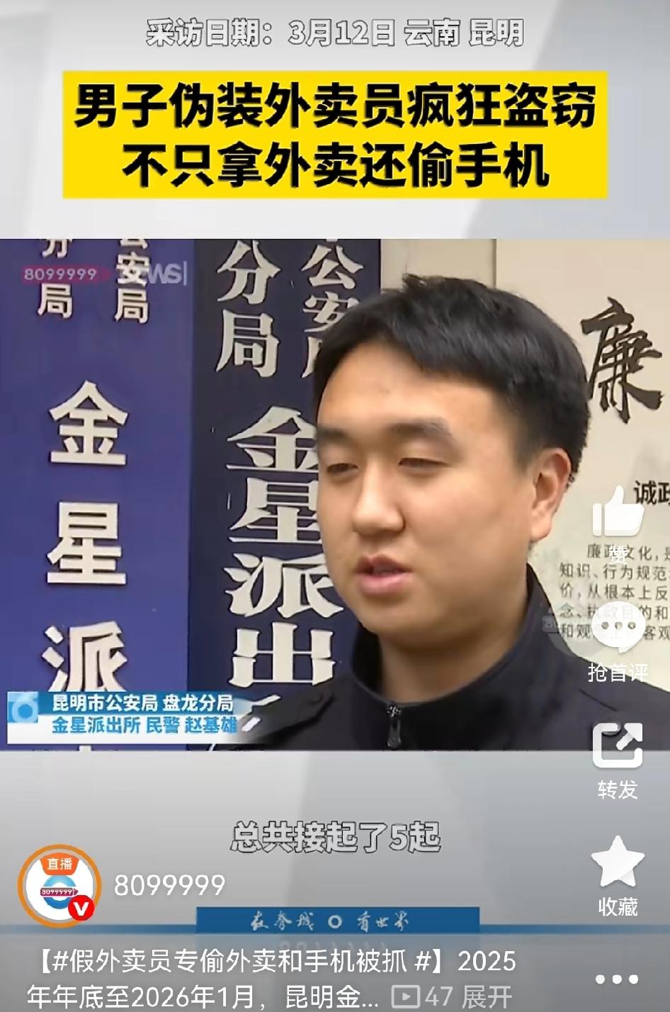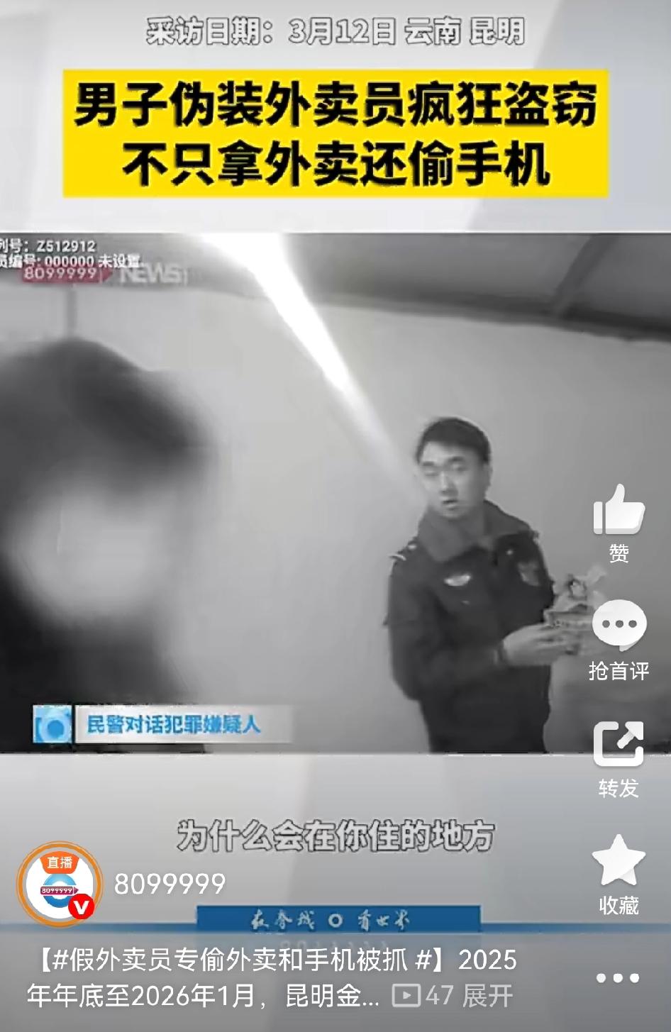 现在的小偷真是越来越会“伪装”了! 【假外卖员专偷外卖和手机被抓 】 外卖小哥盗窃 2025年底到2026年1月,昆明金星派出所接到5起商铺被盗案,被盗的有外卖还有手机。这嫌疑人不是外卖员,却扮成外卖员进店取餐,让商户放松警惕,多次作案成功。 警方也很给力,通过监控锁定了嫌疑人身份,还长期蹲守,最后在罗丈村把人抓住了,查获3部被盗手机和外卖餐盒,涉案价值大概1万元。目前这人已经被依法采取刑事强制措施,案子还在进一步调查。商户们以后可得多留个心眼,别被这种“假外卖员”给骗了!