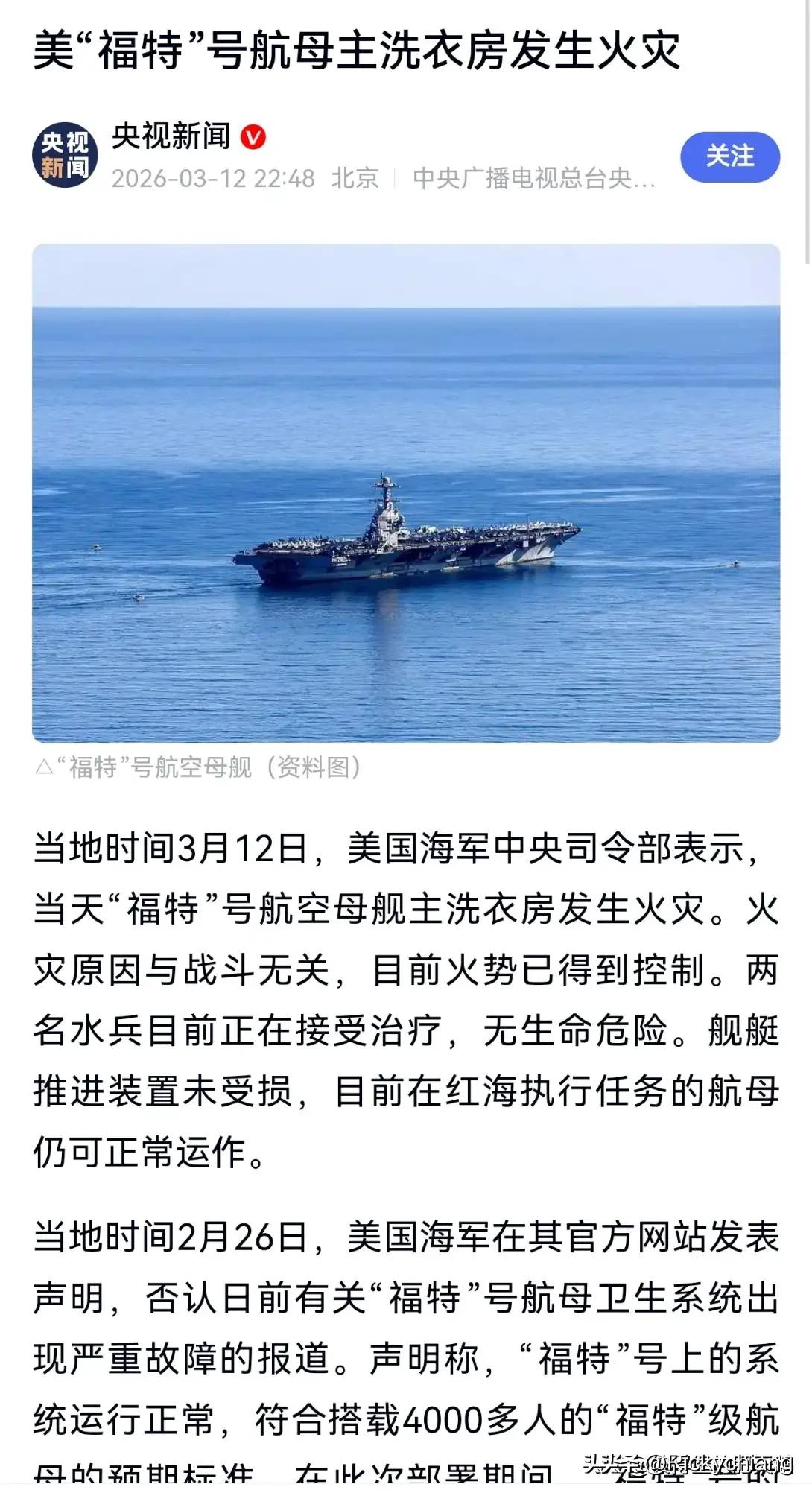 福特号航母“火了”,这次真起火!🔥 前面厕所马桶堵塞,后面洗衣房起火,两名士兵受伤。严重怀疑美国大兵想回家休假了。 福特号航母最近可真是“状况百出”啊!2月全舰650个真空马桶近九成失灵,4600名大兵排队如厕超40分钟,维修人员日均抢修19小时,4天搞定205次故障,核航母秒变“掏粪船”。刚把马桶问题解决,3月12日主洗衣房又起火,两名水兵受伤。 这到底是咋回事?一方面,福特级盲目堆新技术,真空排污等系统不适合军舰高强度使用,建造工艺也有问题。另一方面,大兵们超期部署、高强度执勤,心态难免受影响。与其说是大兵故意搞破坏,不如说是设备脆弱加上人心涣散,小故障变成大事故。这基础后勤都搞不定,还谈啥实战呀!