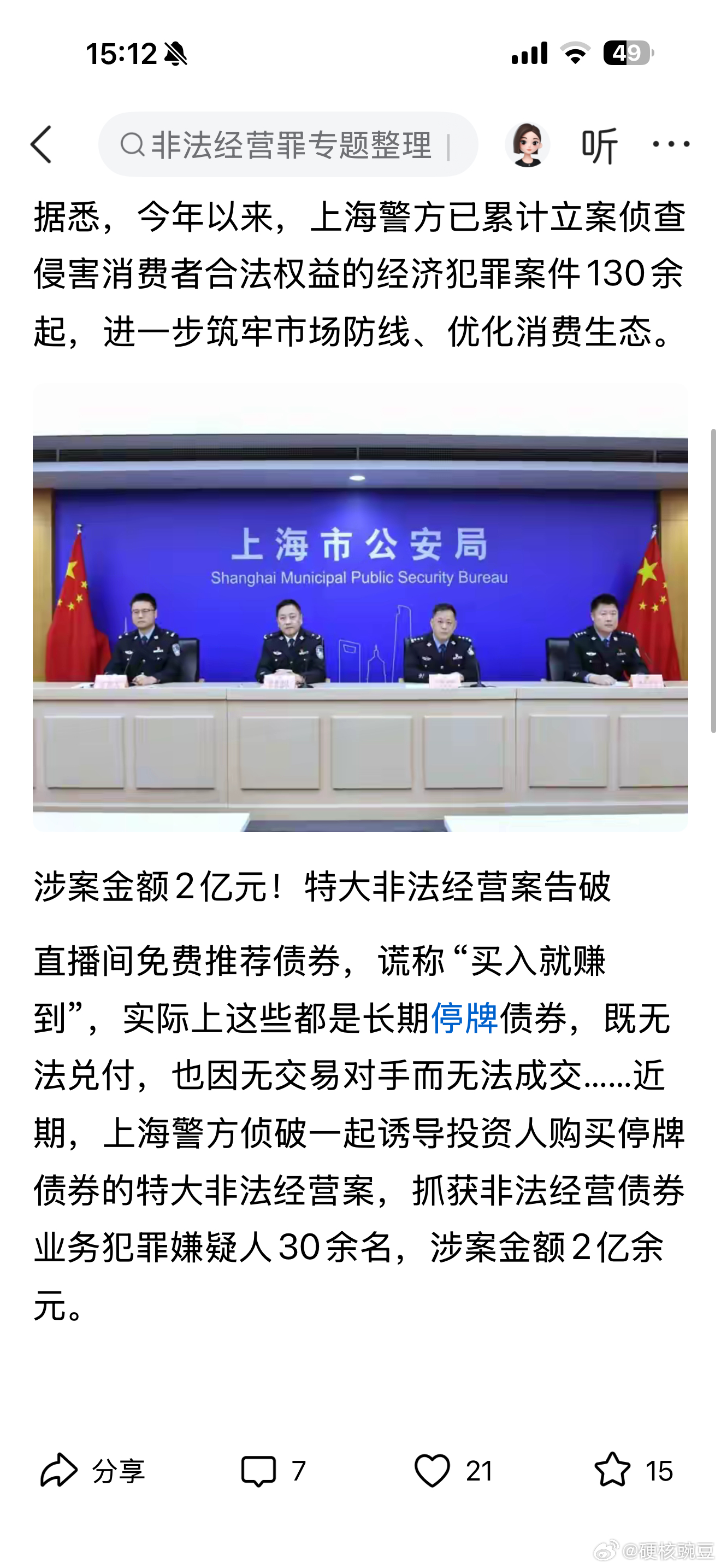 涉案金额2亿元!特大非法经营案告破直播间免费推荐债券,谎称“买入就赚到”,实际上这些都是长期停牌债券,既无法兑付,也因无交易对手而无法成交。微博上面也有一些找我金融合作的,我才不干。为了点蝇头小利害得别人倾家荡产,自己早晚也会跟着倒霉。
