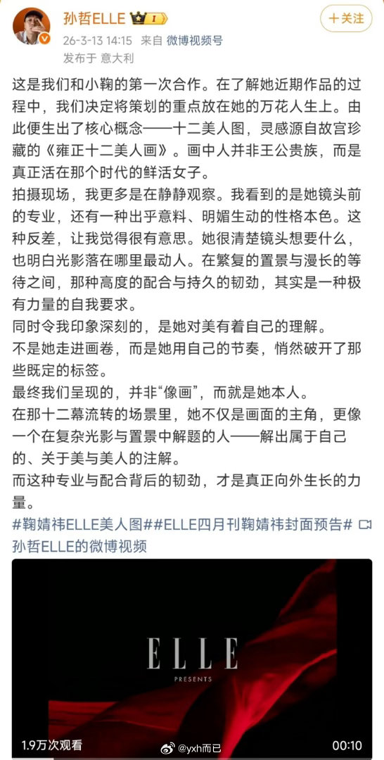 鞠婧祎 ELLE美人图 ELLE主编盖章夸鞠婧祎了!说她镜头前非常专业,性格明媚