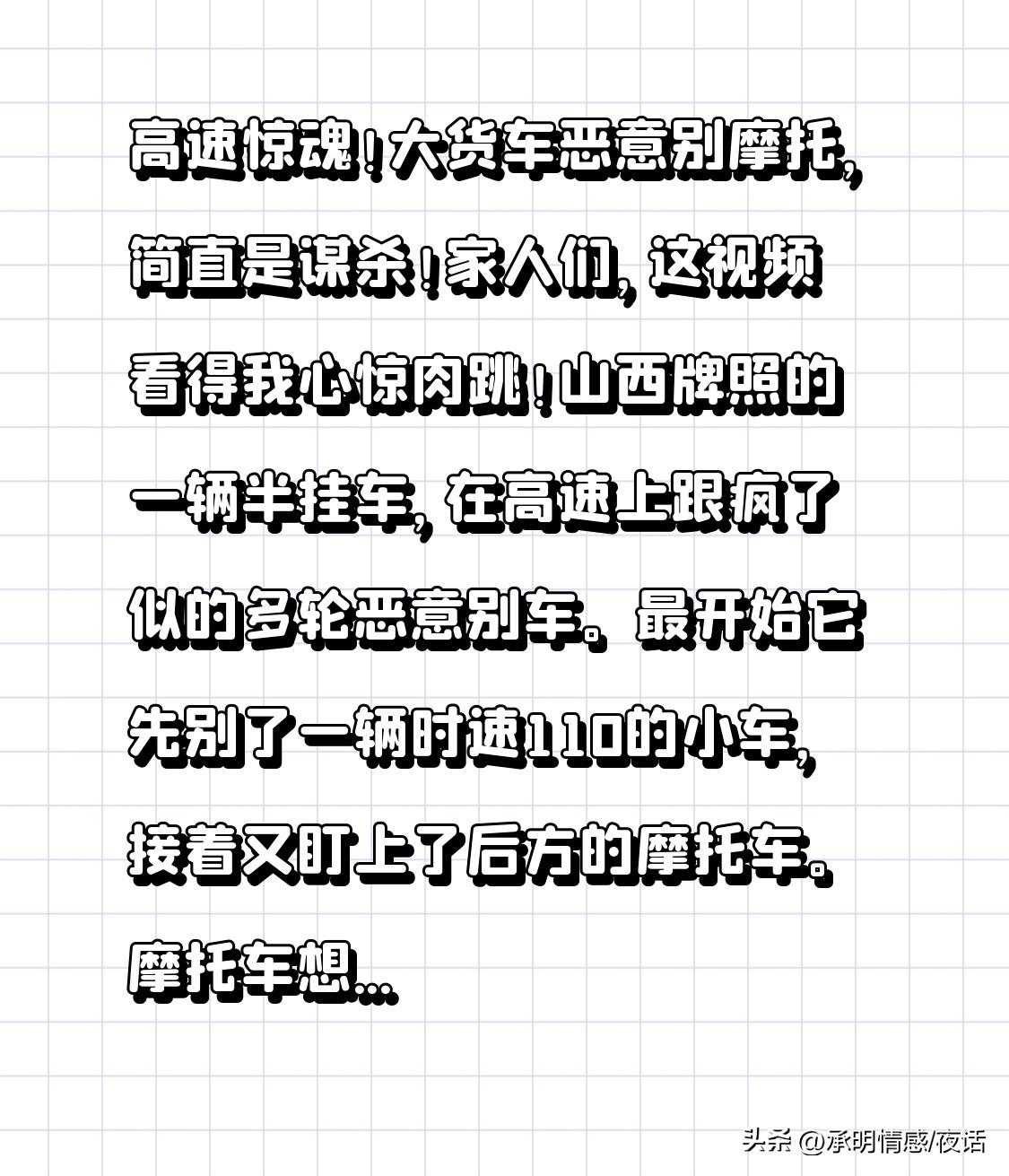 高速惊魂!大货车恶意别摩托,这简直是谋杀! 家人们,看这视频我心都提到嗓子眼了!山西牌照的半挂车,在高速上像疯了一样多次恶意别车。 它先别了时速110的小车,又盯上后方摩托车。摩托车超车时,没车的情况下货车猛打方向硬挤,直接撞飞摩托车,骑手从护栏缺口摔出,生死未知。“路怒症”害人命、毁家庭! 遇到这种蛮横的,保命要紧别硬刚。你觉得大货车司机该咋判?点赞收藏,评论区为骑手讨公道! 货车撞人事件 超速泄愤撞人 大货车乱停乱放 高速摩托争议