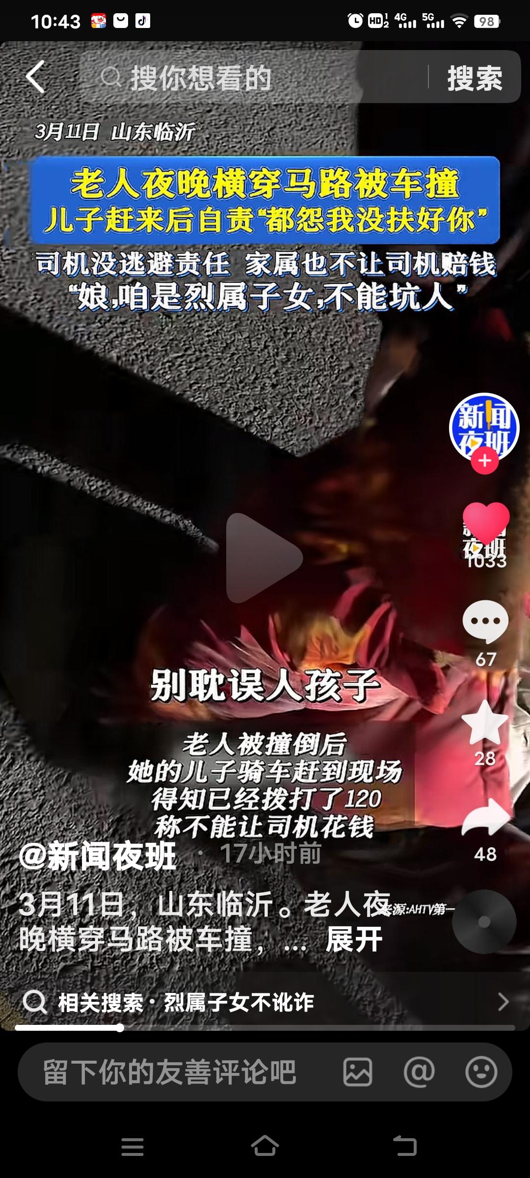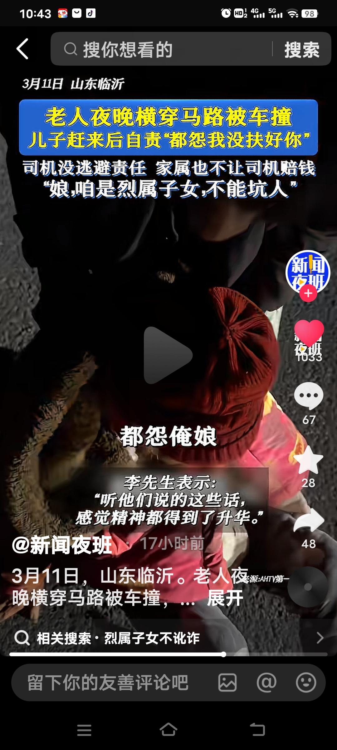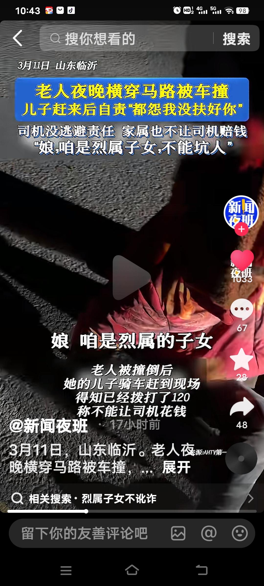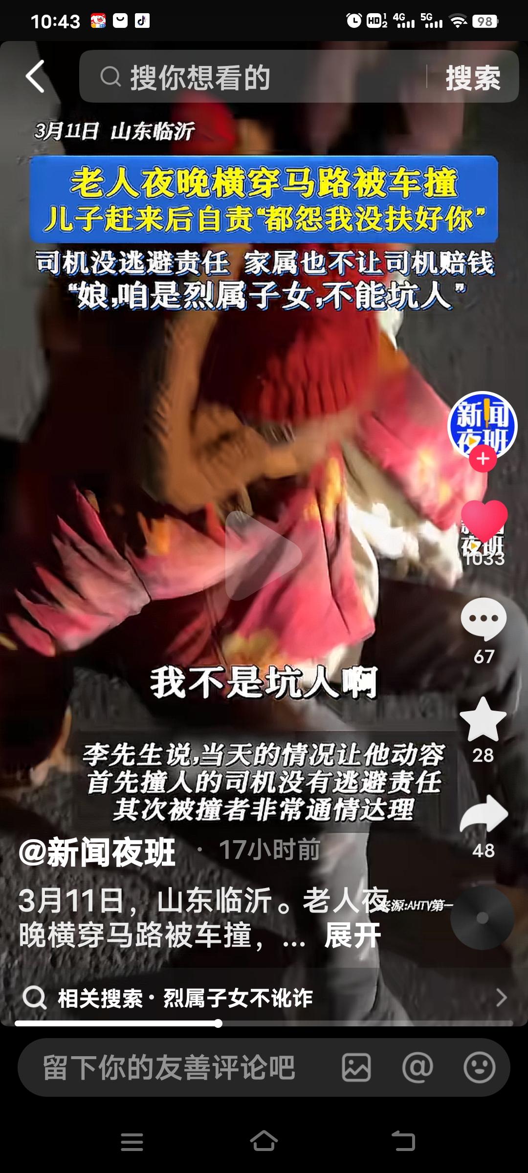 山东临沂这起交通事故太暖了。3月11日,昏暗乡村公路上,路灯昏黄,肇事司机因视线受限撞倒横穿马路的老人。 以往这类事故,家属过激反应、讹诈索赔的消息不少。可这次,老人儿子赶到后,第一时间关心母亲,没指责司机,反而自责“怪我没看好母亲”,还安慰司机。他那句“咱是烈属子女,不能坑人”。 李先生表示听他们讲这些话太动容了,司机也也没有逃避,,红着眼眶表示自己有责任。对方又通情达理,展现出人性的善良。 最终老人被儿子播打120送医院检查,还说不让司机花钱。在如今事故纠纷频发的背景下,这样的事太让人感动,也让我们看到了人与人之间的温暖与担当。 山东撞人案 山东老人撞人案