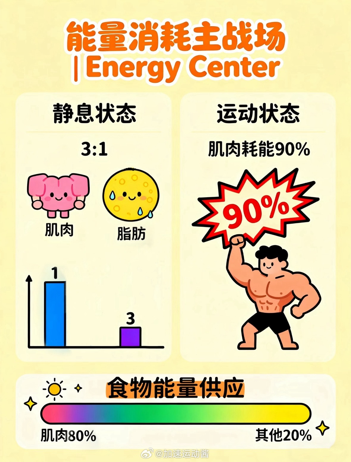 静止时肌肉耗能是脂肪3倍;运动时达全身总耗能90%!食物中80%能量分配给肌肉!
