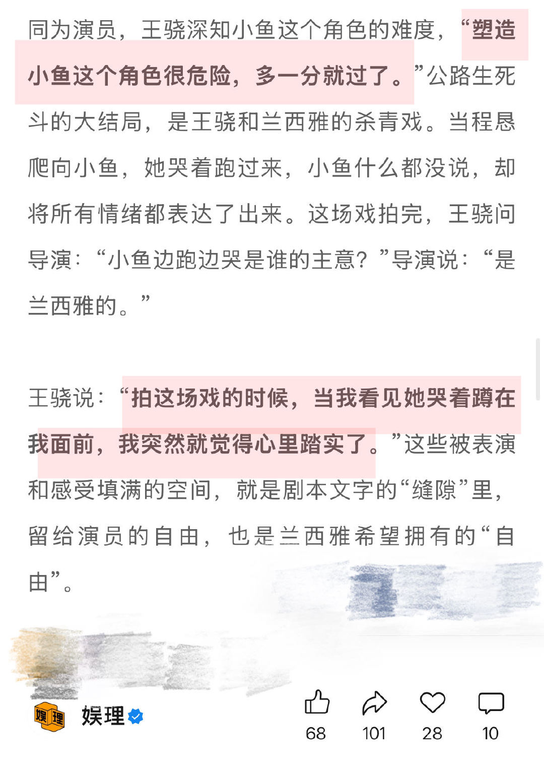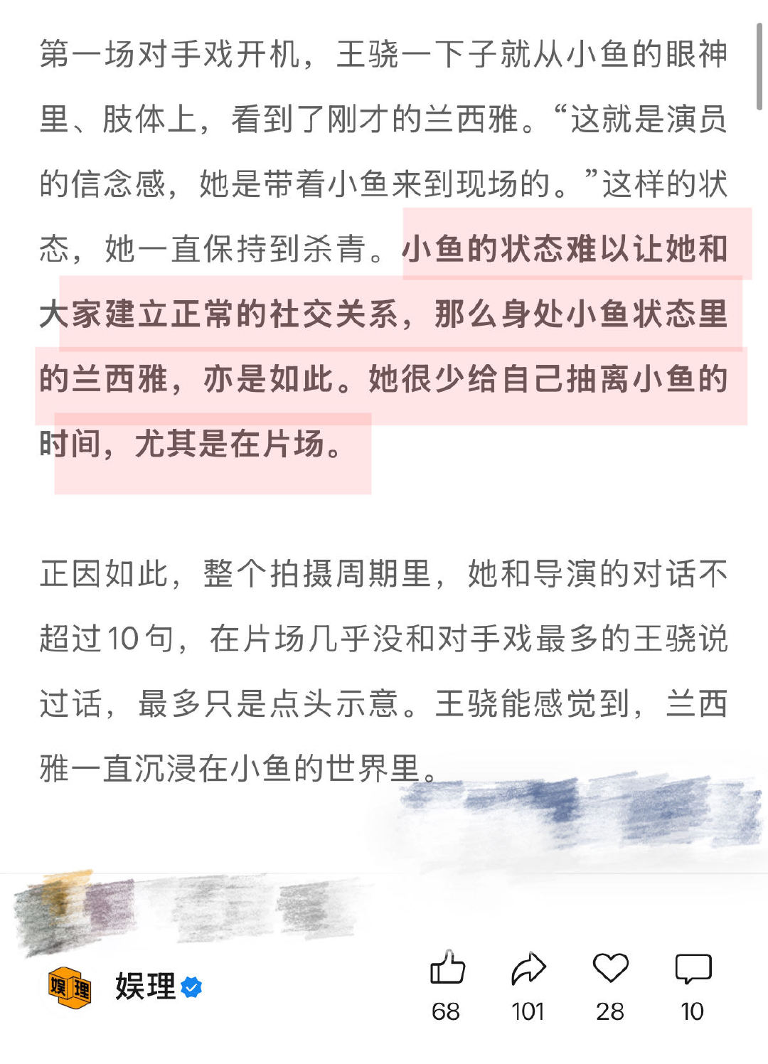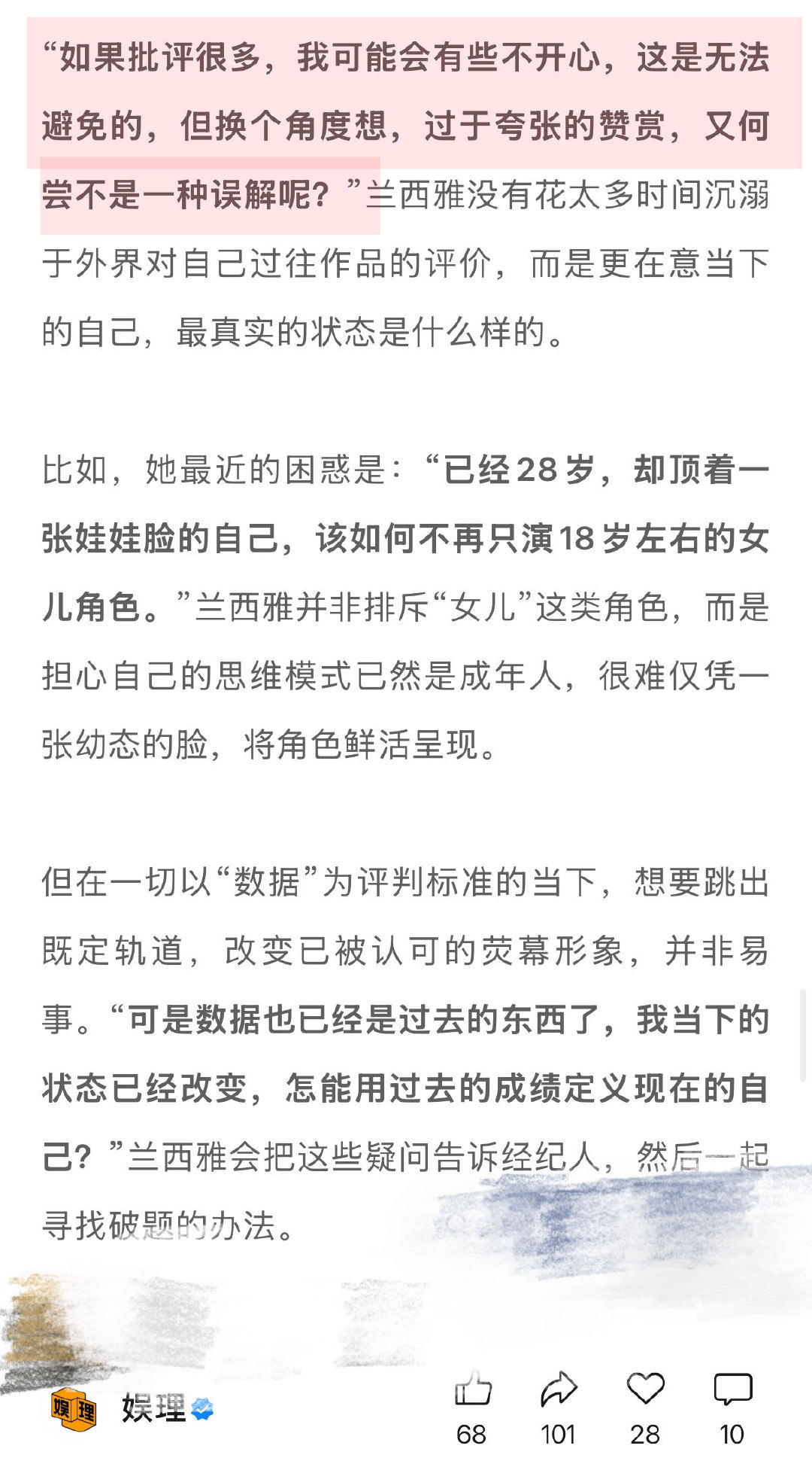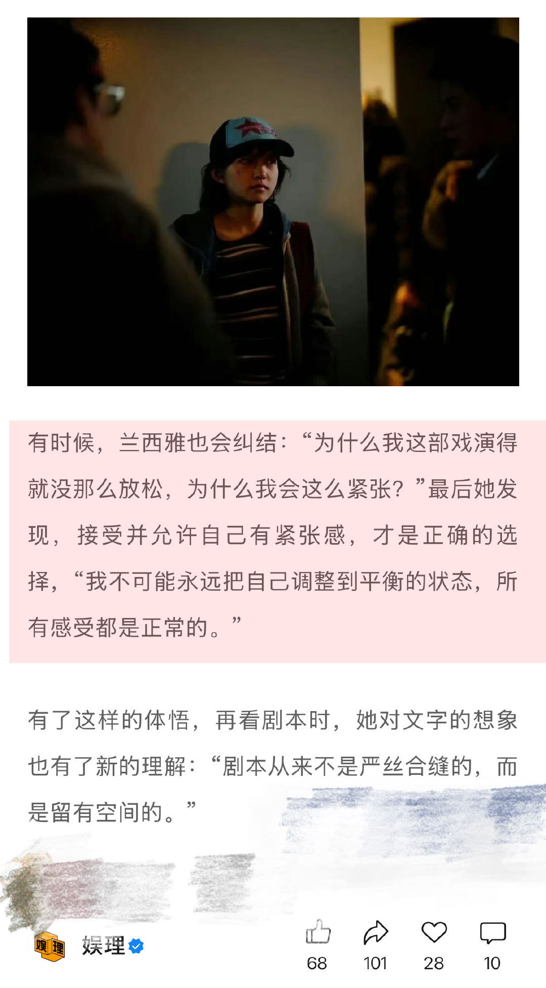 兰西雅担心幼态脸影响角色呈现 兰西雅谈过于夸张的赞赏何尝不是误解 也会纠结:“为什么我这部戏演得就没那么放松,为什么我会这么紧张?”后来她开始接受并允许自己有紧张感,“我不可能永远把自己调整到平衡的状态,所有感受都是正常的。”因此,她对文字的想象也有了新的理解:“剧本从来不是严丝合缝的,而是留有空间的。”娱理独家↓