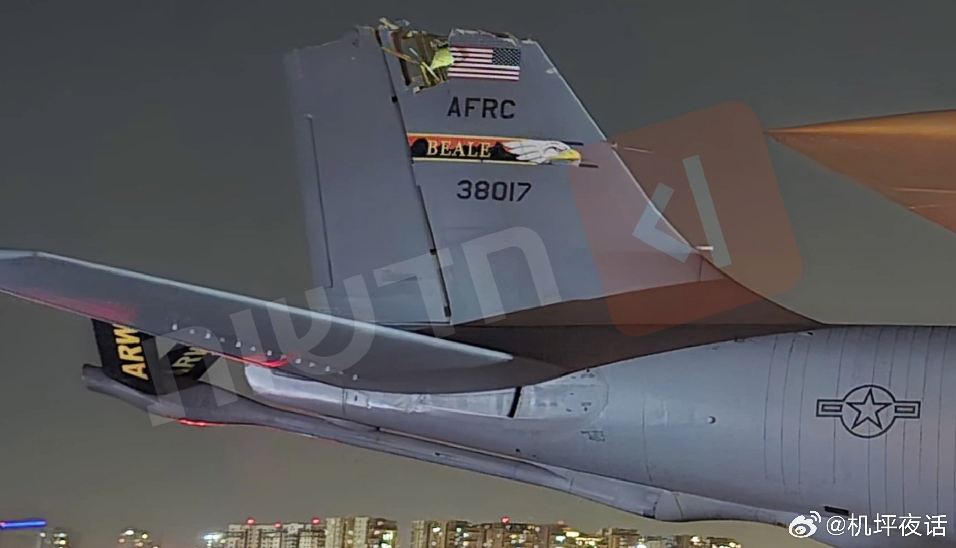 美军侥幸逃生的KC-135加油机迫降照片出现了,可以看到,整个加油机机尾被撞掉一