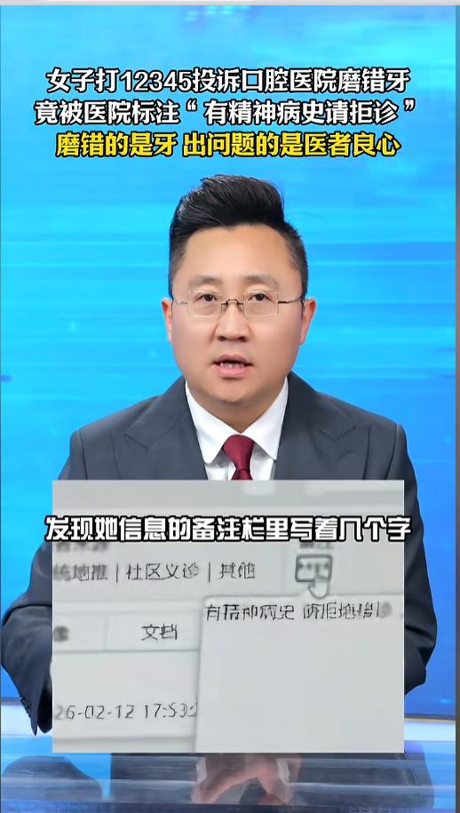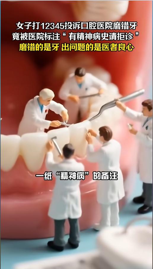 “严查到底!”近日,上海,一女子在医院看牙时,竟然发现自己的牙被磨错了。坏的那颗没被磨掉,好的那颗被磨了。她去找医院理论,医生打死也不承认,院方还把她给拉黑了。自己的病例还被打上了“精神病”的标签,对方就轻飘飘的一句:弄错了! 都说医者仁心,可有些医院早把它抛在了脑后,满脑子里只想着钱,把患者当成了赚钱的韭菜。 据媒体3月11日报道,吴女士因为牙齿问题,去了一家医院做了调磨。回去之后,她发现自己的牙被磨错了。自己完好的那颗牙被磨了,坏的还留在那上面。从此,吴女士走上了自己糟心的维权之路。 她先是去找了医院,谁知医生死不承认,医院也不道歉,气得她打12345进行了投诉。谁知这之后她竟然被院方拉黑了。找医院行政,对方竟还骂她有病。 吴女士又去医院调取了就诊记录,一看之下,更气愤了。上面竟然写着“有精神病史,请拒绝接诊”。她去质问,院方就轻飘飘一句,可能是和另一个人的信息弄混了。 无奈之下,她把自己的遭遇告诉给了媒体,只希望自己能要一个公道。 网友看后表示,现在有些不良医院都是高高在上惯了,太过于傲慢。动不动就是“弄错了,弄混了,系统原因,不关医院的事”,一点责任也不想负。其实就是光想着业绩去了,也缺少了监管。希望这件事相关部门能给出个公道,也希望这个公道来的不要太晚! 信息来源:《女子被磨错牙维权遭院方标注精神病史!磨错的是牙, 出问题的是医者良心》零度时评