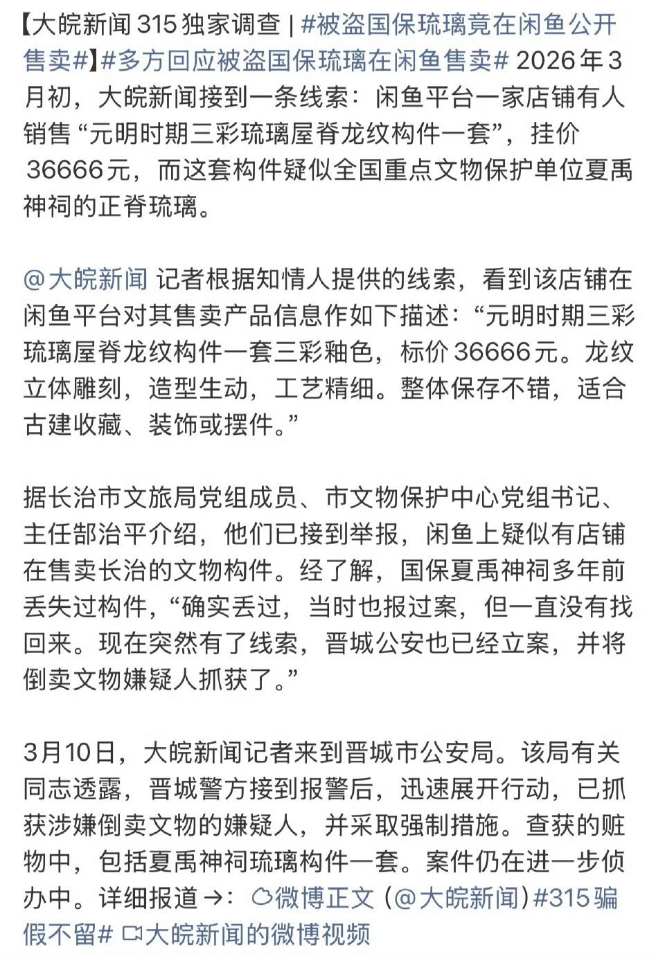 所以说有时候真的觉得国家文物保护单位真的挺不容易的,连闲鱼上的线索也不会放过,希望我们国家丢失的文物都能早点被找回来!