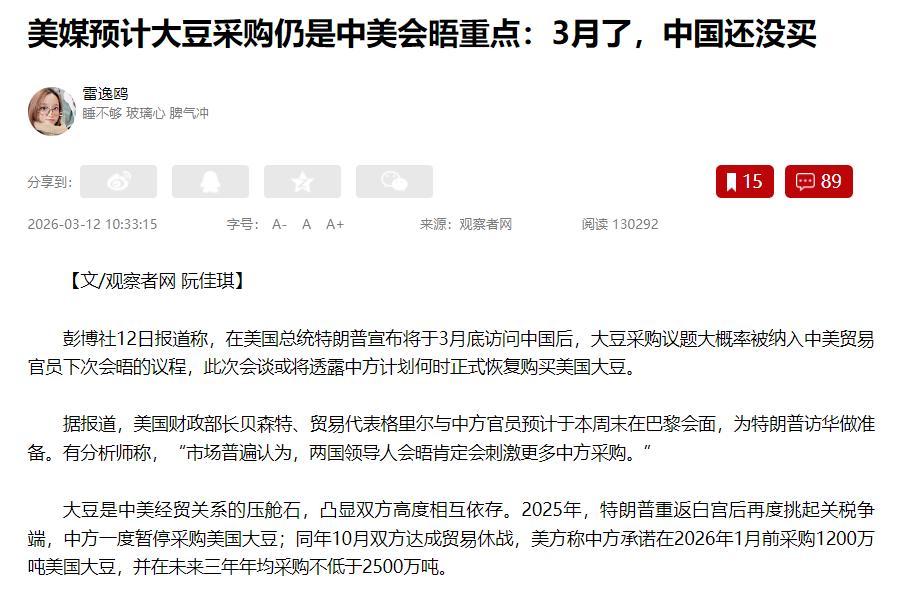 川普访华前夜,又上演“极限施压”。16国“战书”刚刚抛出,想靠加税续命,结果中国市场冷静比拼,直接暂停美豆采购,由头到尾都是一出你来我往的现实大戏。 美国政府原本等着中国再买一波大豆给见面礼,没想到,中国榨油厂更精,计算器一敲,转单巴西大豆,直接让美农焦虑升级。眼下,谈判还没开场,这场专机之旅的主心骨已经变了味。 就在人们还以为新一轮谈判要开启,川普团队却先抛下16国贸易“战书”。美国贸易代表格里尔亮出301条款,不只对着中国,连欧盟、日本、印度都一锅端。 这场面看起来气势汹汹,实则无可奈何。美国最高法院刚把旧关税判了违宪,退税窟窿堵不上,只能临时抱佛脚,拉起“301调查”争取再造一个关税工具。 川普政府巧妇难为无米之炊,只能拿所有主要贸易伙伴“堵窟窿”。调查结果没出来,华尔街、农场主、市场都在观望,压力早已藏不住。 川普这边要“施压”,中国市场却比他还安静。数月前,中方刚刚完成美豆1200万吨采购承诺,3月本该有“新单”,但这次采购窗口静悄悄,一分钱没掏。 美国农场主等着订单,中企却转头买巴西大豆。其实算算账就明白,南半球收获季,巴西大豆又便宜又新鲜,每吨能省下50到80美元。谁会为贵价大豆买单? 中企当然选性价比最高的原料。说白了,这不是和美国较劲,只是市场自有规则。外加13%的美豆关税没撤,中国采购方自然不吃亏。 专机启动前,记者注意到原定三天两夜的川普访华行程被悄悄缩水,只剩北京一站。先遣小组提前撤离,周边安排一切收紧。 这一切释放信号再明显不过:白宫手里的核心筹码在变少。关税手段刚被法院打回原形,中东局势又让美国国内能源和通胀压力飙升,川普团队不得不见招拆招。 油价涨到每加仑3.54美元,美国国内早已怨声载道,外部压力分走了大半注意力,访华本应是外交主场,如今招数被限,腾挪空间一砍再砍。对比中方的从容以对,美方筹码明显失重,谈判桌上的主动都快变成了防守。 川普以为加个税、甩个名单就能让中国妥协,发现真正难的不是政策,而是市场选择。16国调查让贸易秩序起了波澜,但市场自有天平,中国采购不用“善意套路”,更看重价格与稳定。 美国农民焦虑加剧,市场没等官员发号施令,已经自主寻找活路。这才是一场生意场里的真刀真枪。美国筹码缩水、内部压力飙升,中方没有大声回应,却用行动写明了底线。 飞机还没落地,北京市场已经先变脸,贸易谈判变成静默对峙游戏。川普即便带着施压大棒到访,换来的未必是“善意见面礼”,压力反而率先传到了本国农民手里。 这一场大戏,真正稳得住的那一方,已在牌桌之下占了先机。未来博弈,不看喊话多狠,还是得看谁能把主动权稳在自己手里。