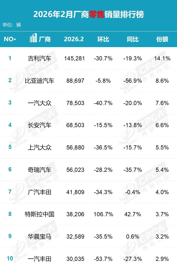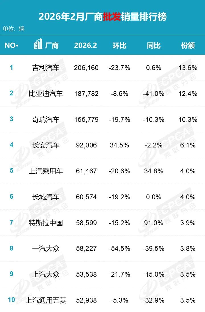 2月国内汽车销量正式出炉! 全国销量180.5万辆,受春节影响,同比下降15.2%,环比下降23.1%。 批发销量排名重磅出炉: 吉利以20.6万辆强势登顶,比亚迪18.8万辆紧随其后。 零售端竞争同样激烈: 吉利再度领跑,比亚迪位居第二。 2月车市最大看点: 吉利双榜超比亚迪,成功夺冠! 自主双雄争霸,市场格局迎来新变化。