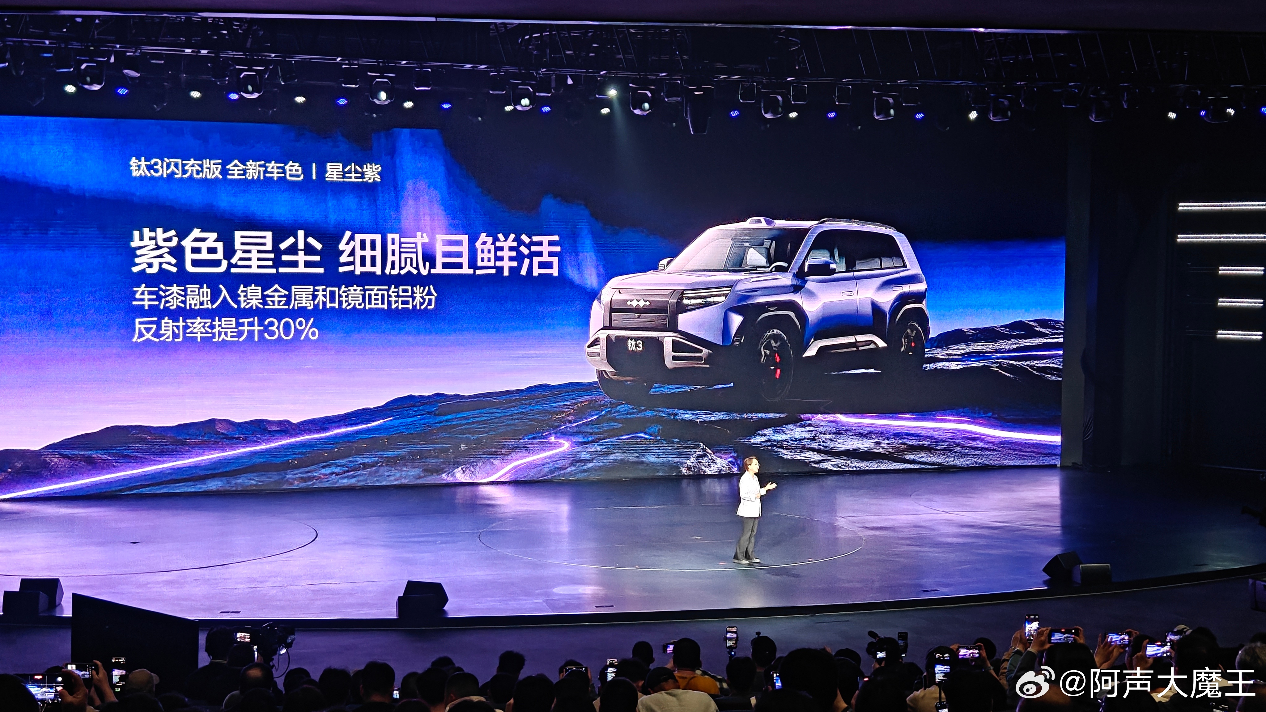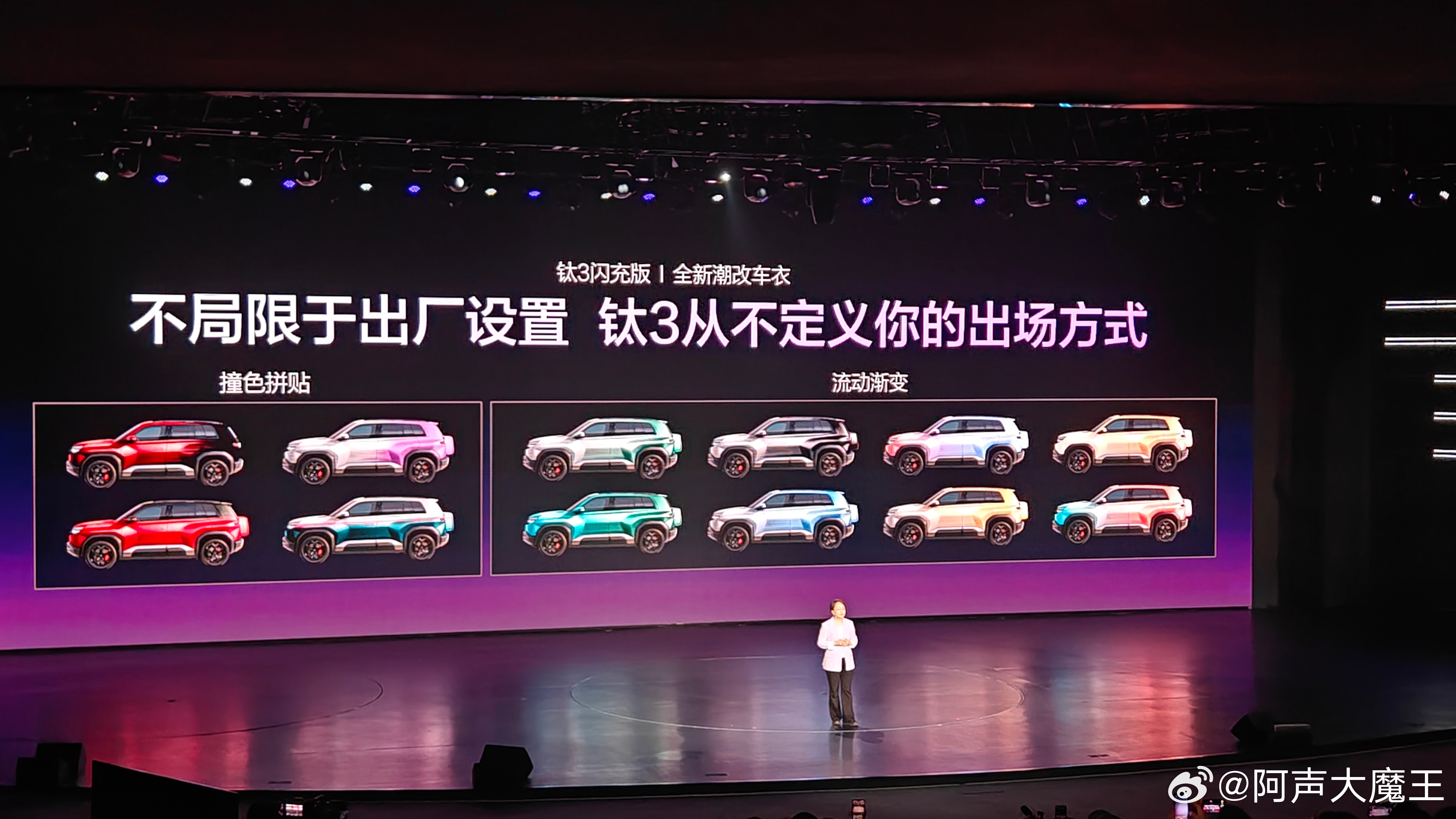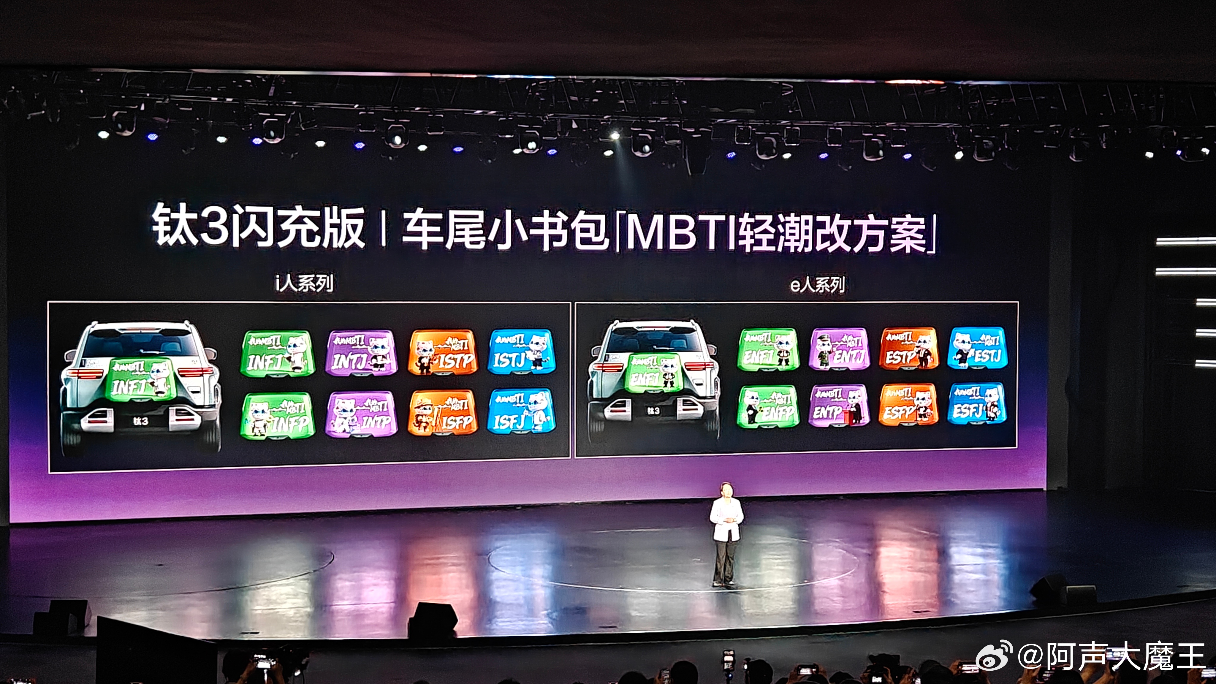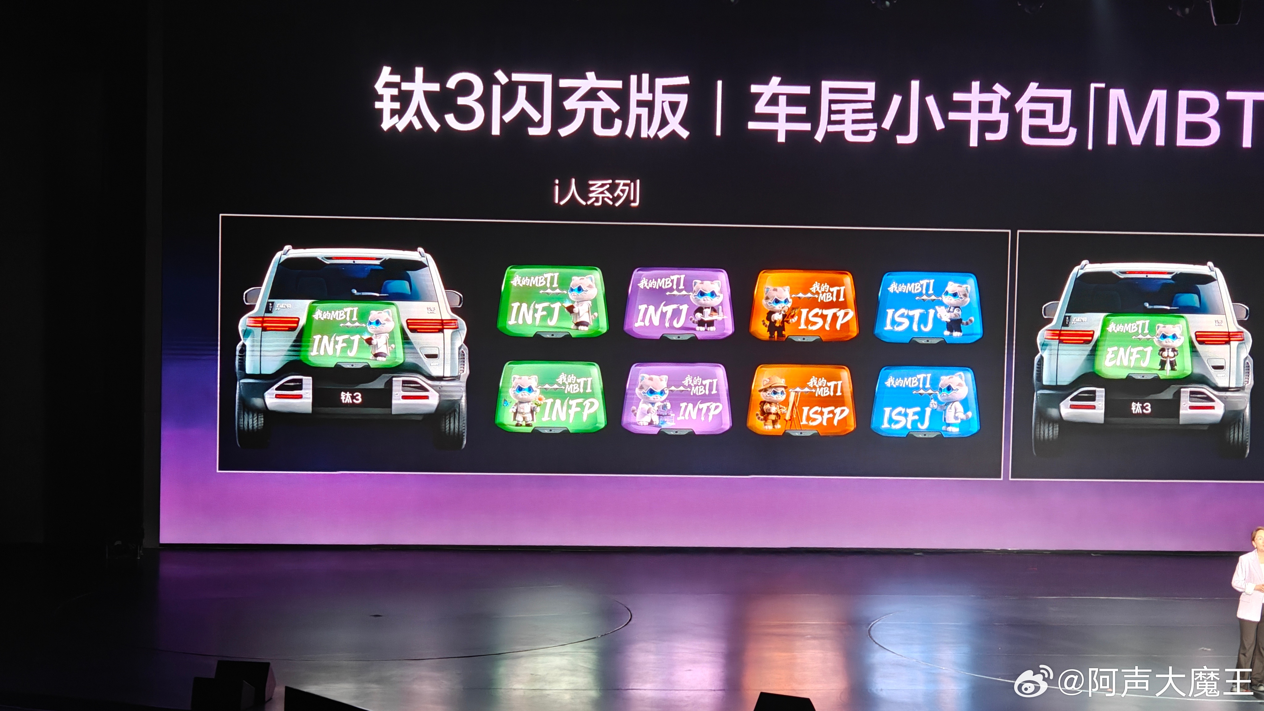 新款的钛3闪充版,外观新加了“星尘紫”配色,果然紫色最有韵味啊~内饰方面新增了“灰蓝双拼”——冷静冰川灰➕深邃极地蓝新加的车衣设计也有两大款式——流动渐变版和撞色拼接版。车尾小书包方面也新加了「MBTI 轻潮改方案」真的是挺贴潮流了,来看看属于你的『MBTI 』车尾小书包吧~方程豹钛3