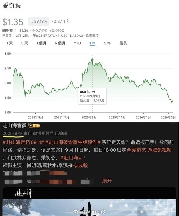 大热演员新剧开播会带动平台股价暴涨的!有网友发现2025年爱奇艺最高点是9月9日成毅赴山海定档的日子……爱奇艺股价