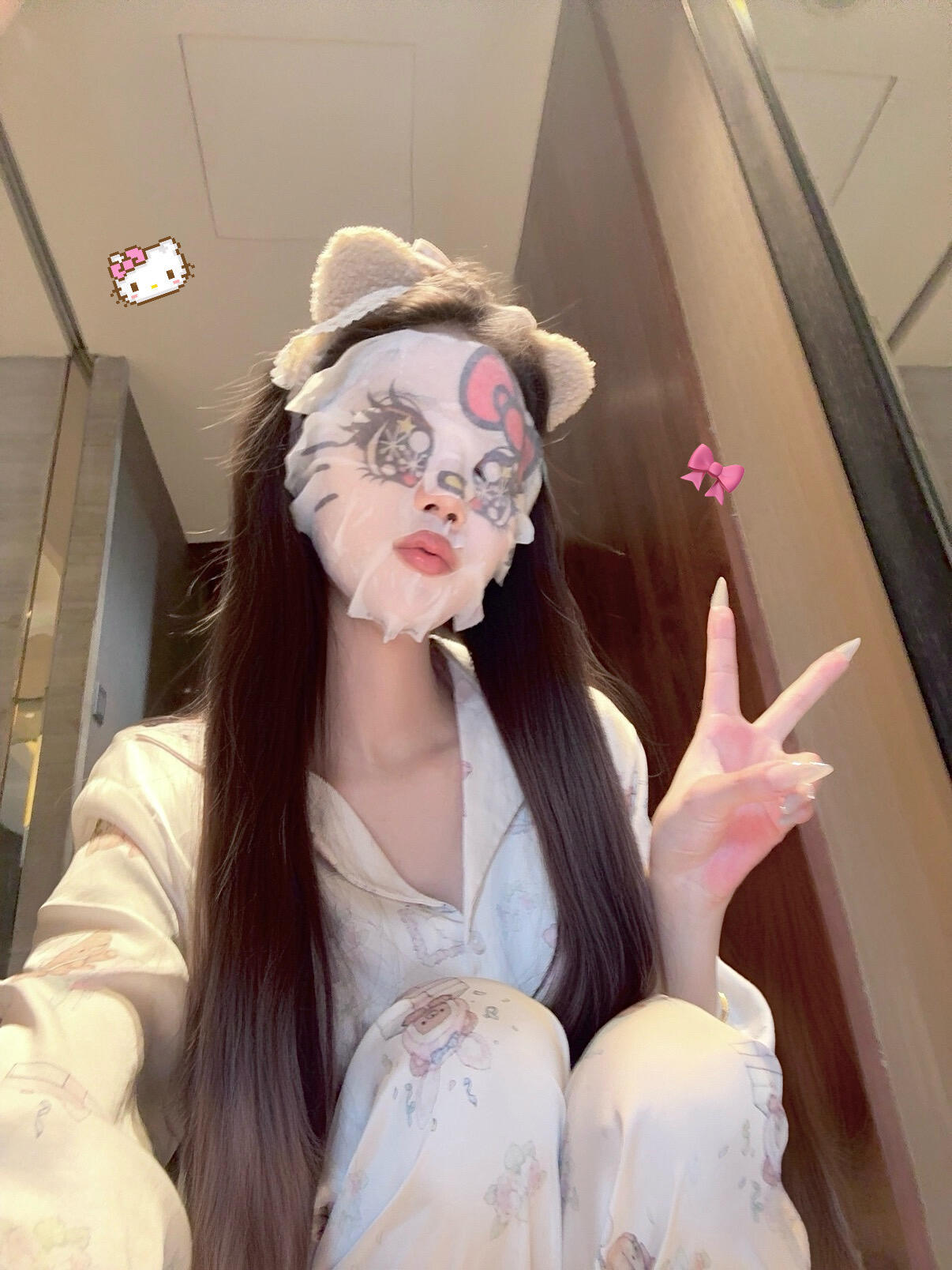 🎀 ꉂ ・ ・ ☆.ᐟ Hello Kitty‧₊˚也是贴上可爱的kitty面膜啦