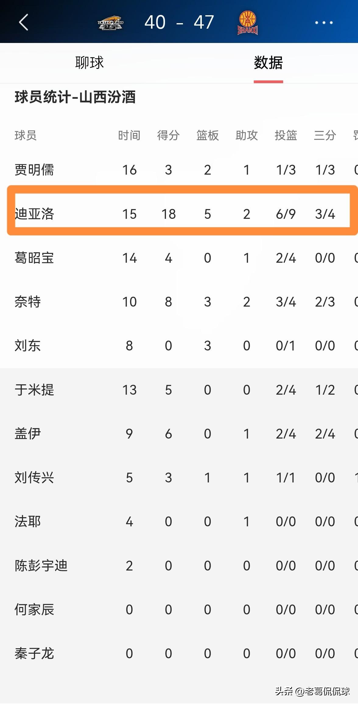 山西汾酒超级外援迪亚洛真是杀红眼了!在今天山西汾酒客场挑战辽宁本钢的比赛中,目前双方半场战罢,山西汾酒凭借着迪亚洛的出色表现以47:40领先对手。 在前两节比赛中,迪亚洛首发出战15分钟,投篮9中6,其中三分球4中3、罚球9中3砍下18分,外加5篮板2助攻1抢断,没有出现任何的失误,他的场上正负值为+8。 在上半场比赛中,杀红眼的迪亚洛简直就是无可阻挡,迪亚洛不愧是当今CBA最强外援之一。