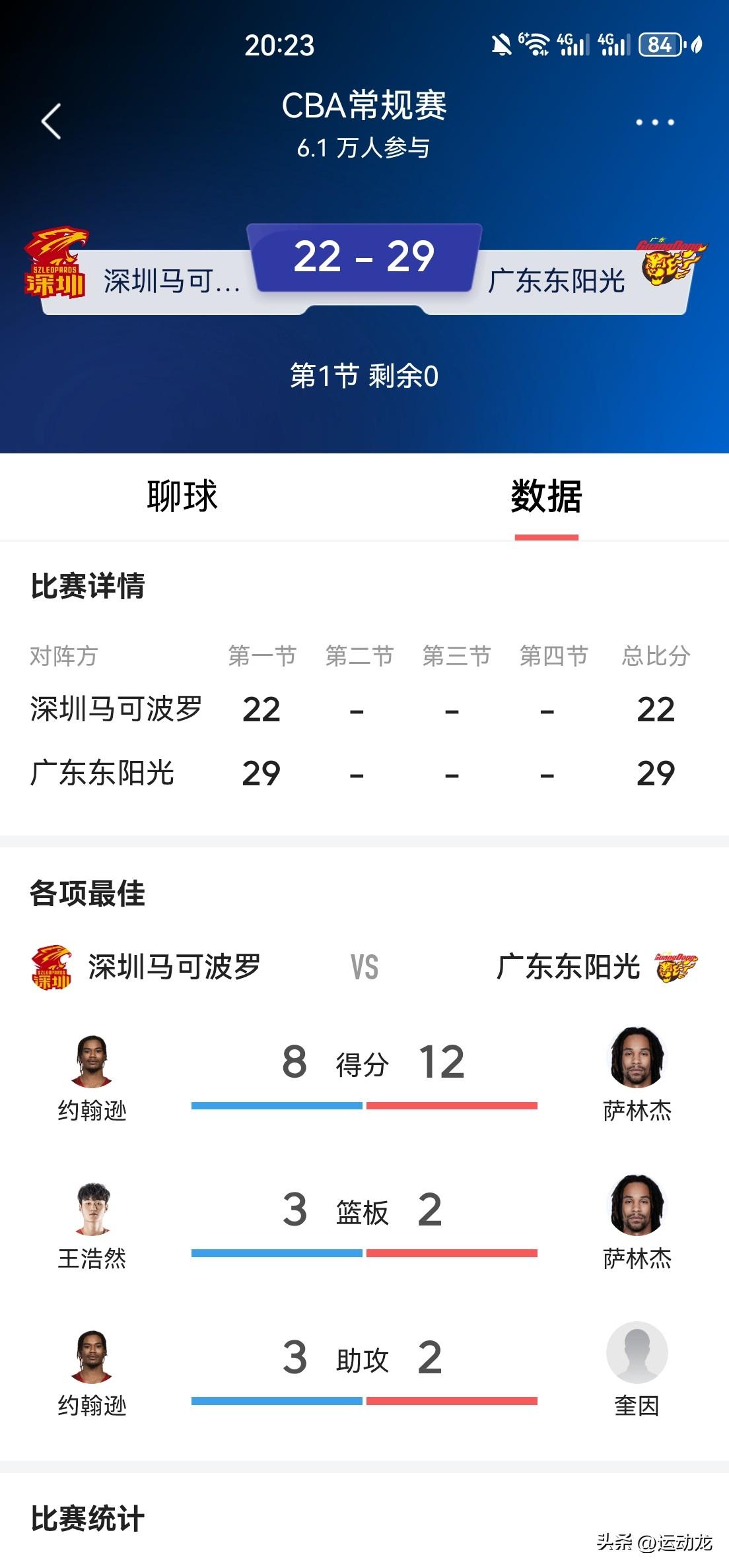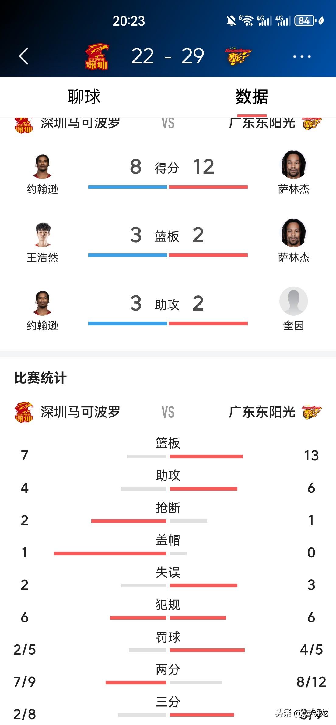 广东难兄难弟德比,宏远拒绝四连败!此战前宏远三连败,深圳两连败,究竟谁能率先摆脱连败? 萨林杰状态回勇,首节7投4中,砍下12分2篮板,胡明轩、陈家镇均2投2中,分别拿下5分和4分,帮助广东宏远29:22领先深圳队。奎因5投1中得到3分,杜润旺3投0中。