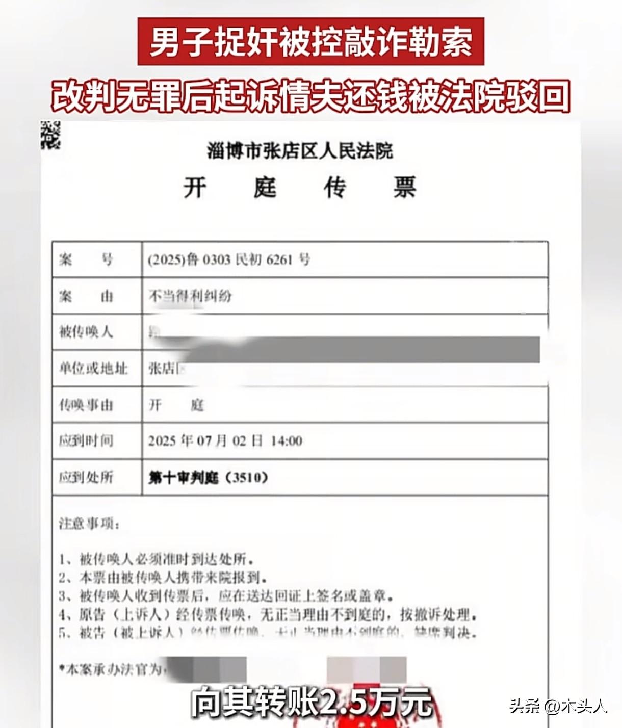 山东淄博,男子发现妻子和情夫在酒店房间内,勃然大怒,情夫主动提出补偿,男子收了对方25000元。不料事后情夫报警,称被男子敲诈勒索,男子家人为了求得谅解,将25000元主动退还给了对方,男子在被判刑后,经多次上诉、申诉后改判无罪。之后男子父亲将情夫告上法庭,要求对方返还25000元,可法院的判决出人意料! 一想起儿子捉奸后遇到的糟心事,路先生就不禁悲从心来。 自己儿子路某本是受害者,却被指控敲诈勒索,为了证明清白,他不断上诉、申诉,耗费了大量的时间和精力,也把他们家的生活搅的翻天覆地。 2021年3月28号上午,路某瞧见妻子打扮得花枝招展,带着孩子去上辅导课。 他感觉有些不对劲,悄悄跟在妻子张某身后,他看到妻子把孩子送到辅导机构后,转身进了电梯,一路下到了酒店。 他设法找到了妻子所在的房间,并想办法开了房门,结果看到妻子穿着情趣内衣,和一个赤身裸体的男子在屋内。 路某的火气“噌”地一下就上来了,他掏出手机,进行拍摄,并打了男子一拳。 张某见状,穿上衣服后,灰溜溜地走了,路某和那个叫刘某的男人继续留在房间里。 据路某说,刘某自知理亏,为了弥补过错,主动提出要给路某补偿。 路某说要6万,两人协商之后,刘某分3次转了25000元给路某,路某离开时,还顺手拿走了桌子上的200元。 之后路某和妻子因为孩子抚养权的事情,打起了离婚官司。 可没想到,刘某却突然报了警,称路某敲诈自己。 敲诈勒索罪是指行为人以非法占有为目的,对被害人使用实施恐吓、威胁或要挟的方法,非法占用被害人公私财物。 一审法院判决路某犯敲诈勒索罪,判处其有期徒刑6个月,并处罚金5000元。 可路某不服,他认为这25000元是刘某为了弥补过错,主动补偿给自己的,自己没有敲诈勒索。 他一次次上诉、申诉,法院再审后,判决路某无罪。 事情终于有了一个圆满的结局,路某无罪,这对于他们家人来说,是个天大的好消息。 案件改判后,路某的父亲将刘某告上了法庭。 原来,路某被控告后,路先生将25000元主动退还给了刘某,以求得刘某的谅解,但是他始终觉得儿子无罪,退钱是无奈之举。 他认为这笔钱原本是属于他们的,并且为了替儿子维权,自己身体恶化,患了淋巴癌,需要这笔钱。 于是,他将刘某告上法庭,要求刘某返还25000元不当得利及利息。 可法院却认为路先生诉讼主体不适格,驳回了他的起诉。 《民事诉讼法》第122条规定,起诉必须符合下列条件:(一)原告是与本案有直接利害关系的公民、法人和其他组织;(二)有明确的被告;(三)有具体的诉讼请求和事实、理由;(四)属于人民法院受理民事诉讼的范围和受诉人民法院管辖。 路先生要求刘某返还的这25000元,最初是路某发现妻子和刘某出轨后,要求刘某给的补偿。 在刑事案件侦办过程中,路先生替儿子退还了这25000元给刘某,路先生实际退还的是刑事案件中路某收取的25000元,他并非直接相关权利人,不符合《民事诉讼法》规定的起诉条件。 另外,法律对第三者侵犯配偶权无明文规定,司法实践也不承认构成侵权,25000元补偿款是刘某基于不法原因的给付,不属于法律评价范围。 最终,法院驳回了路先生的起诉。 对于这个结果,路先生不服,已经提起了上诉。 妻子出轨,路某去捉奸,收取情夫刘某25000元补偿款,结果被刘某打倒一耙,控告其敲诈勒索,路某不得不花费时间和精力来自证清白,他的遭遇确实令人同情。 遇到另一方出轨,一定要冷静处理,千万不要冲动行事。 出轨方作为婚姻过错方,在子女抚养和财产分割上占不到优势。 另外,无过错方还可以要求对方给予损害赔偿。 对于此事,大家怎么看?