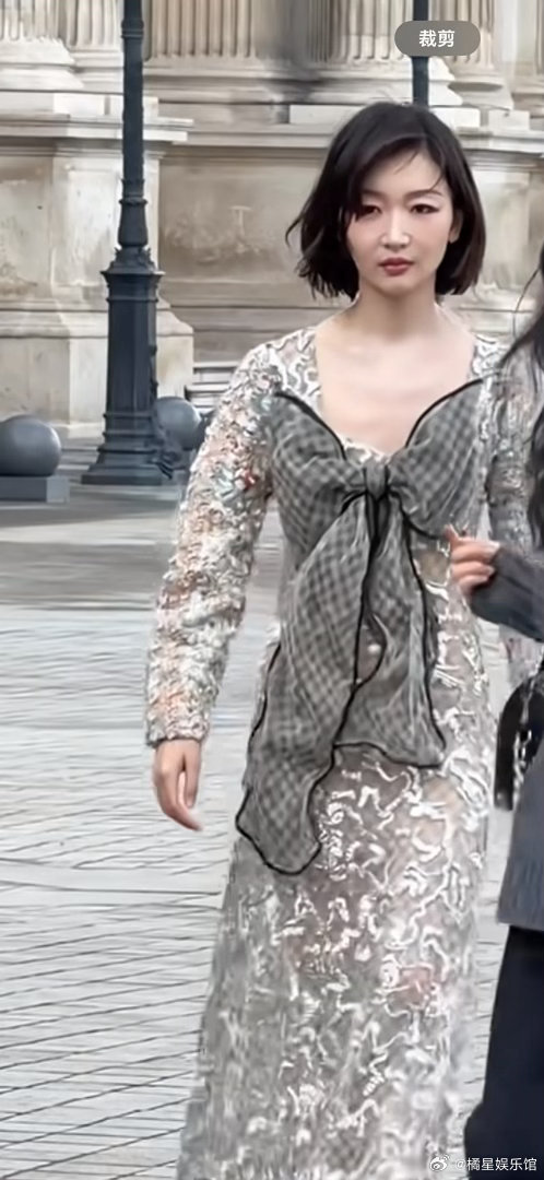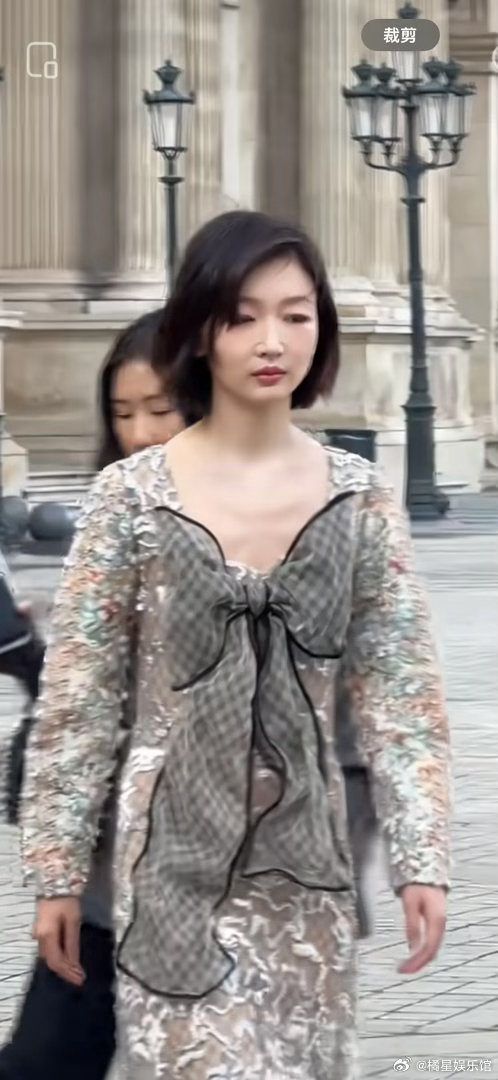 周冬雨LV走秀造型。笑死,周冬雨是怎么做到又瘦又魁梧的?周冬雨现身巴黎时装周L