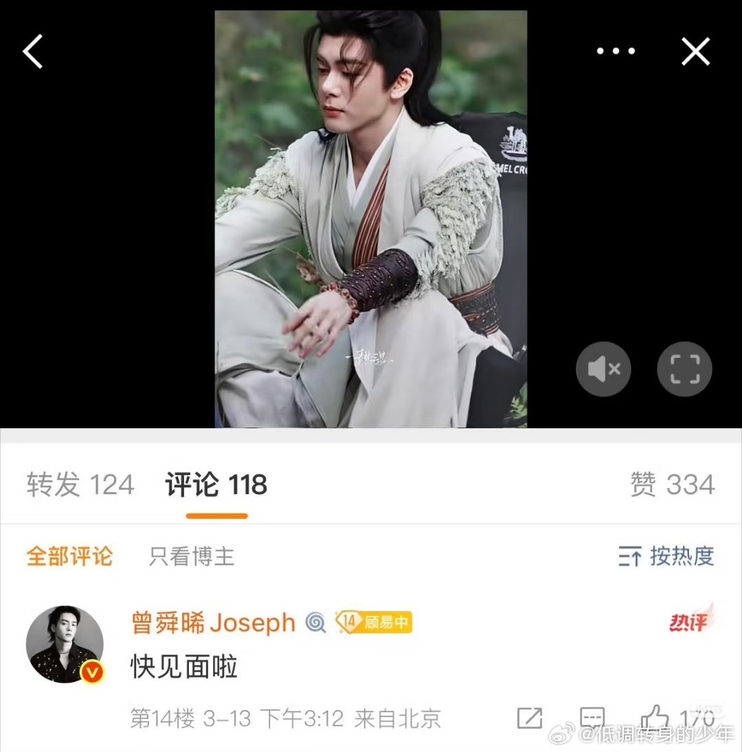 曾舜晞 快见面啦曾舜晞回复粉丝说快见面啦~我信真🍉主的《月鳞绮纪》武拾光~期待