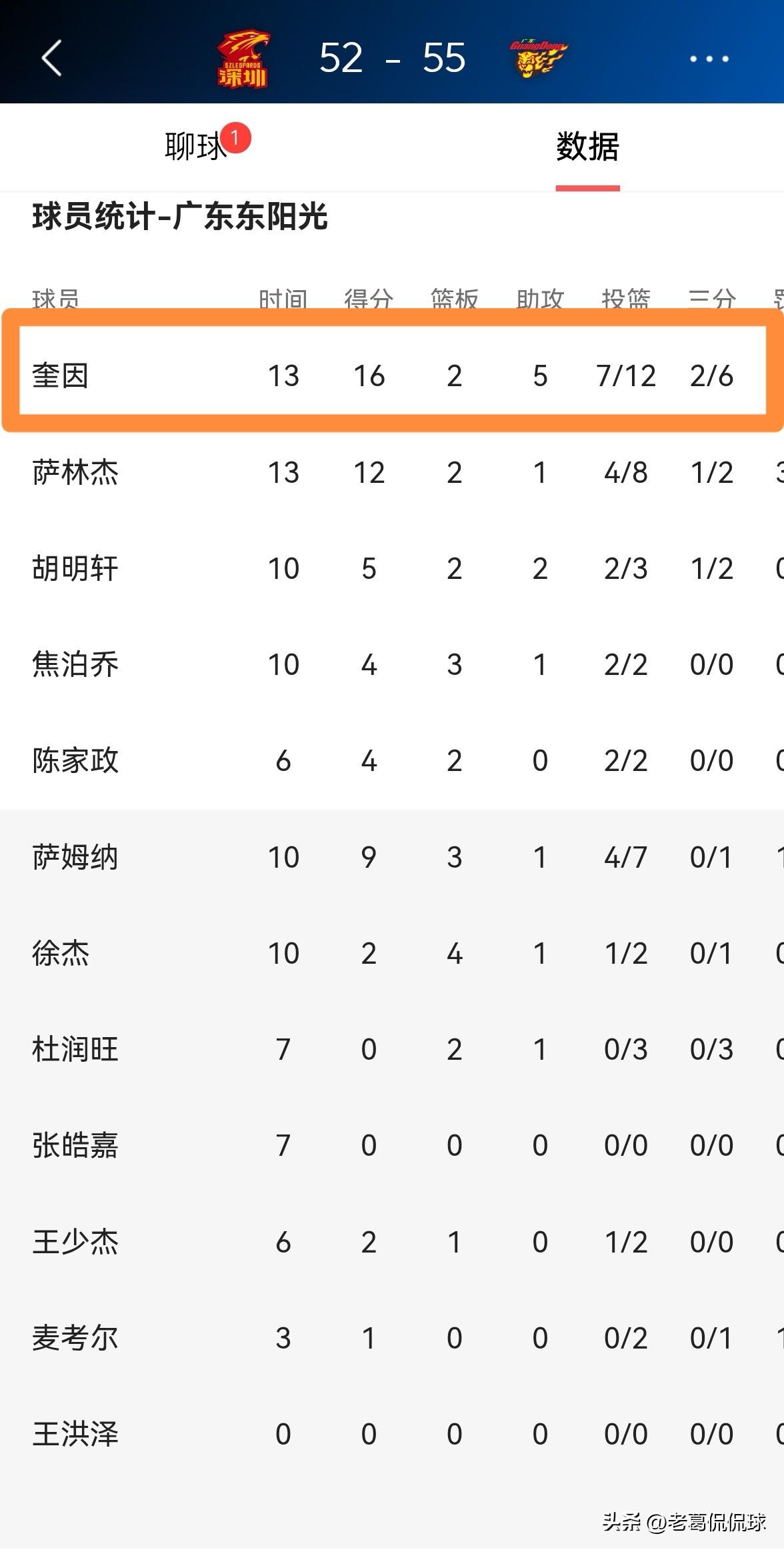 广东东阳光大外援奎因真是大放异彩!在今天广东东阳光客场挑战深圳马可波罗的比赛中,目前双方的上半场比赛已经结束,广东东阳光凭借着奎因的炸裂表现以55:52领先对手3分。 在前两节比赛中,状态非常火热的奎因首发出战13分钟,投篮12中7,其中三分球6中2砍下16分,还有2篮板5助攻,他的场上正负值为+2。 以奎因在前两节比赛中的出色手感来看,我预感本场比赛奎因的得分会突破30分。