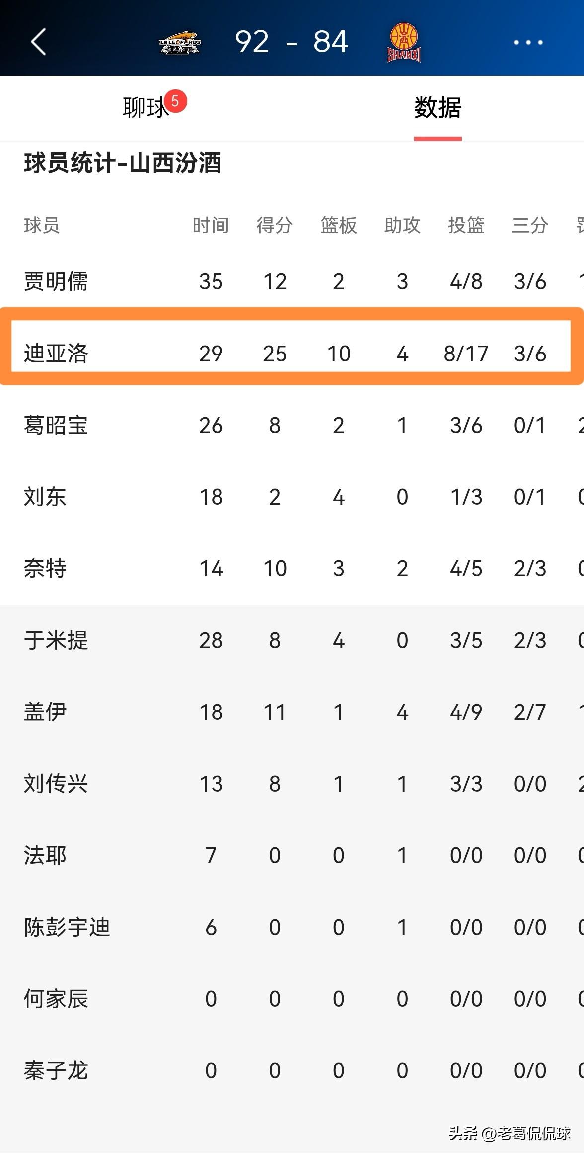 山西汾酒外援迪亚洛终于不嚣张了!在今天山西汾酒客场以84:92输给辽宁本钢的比赛中,纵然迪亚洛拼尽全力砍下25分,却依然无力回天。当比赛结束以后,迪亚洛显得非常失落,他终于不像往常那样嚣张了。 全场比赛下来,迪亚洛首发出战29分钟,投篮17中8,其中三分球6中3、罚球13中6空砍25分10篮板4助攻2抢断1盖帽,还有5次失误。 事实证明,在张宁、原帅两名大将缺阵的情况下,山西汾酒单凭一个迪亚洛翻不起多大的风浪。