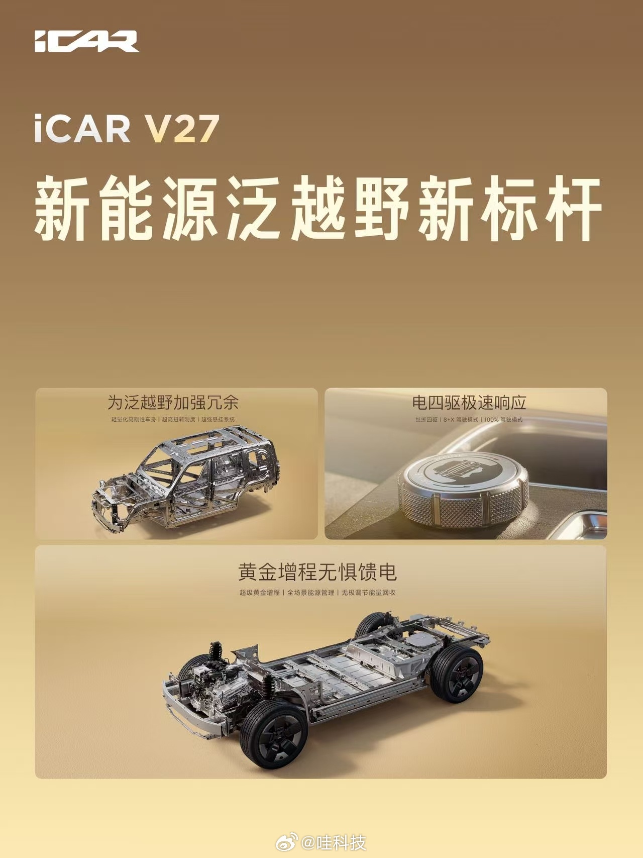 iCARV27 V27全能硬派全家都爱iCAR V27一登场就自带鲜明标签,用设计和实力走出独特路线。未来经典的外观融合复古与赛博风格,双天窗、方正姿态气场十足,即便遮住车标也能一眼认出。车身尺寸接近五米,姿态硬朗却很好驾驭,是真正适合日常家用的方盒子车型。核心层面搭载顶级系统构型与增程发动机,动力充沛且高效稳定,兼顾硬派底气与家庭舒适。智能驾驶达到第一梯队水准,行驶平稳丝滑,出行更轻松安心。同时满足中欧双五星安全标准,搭配车家互联生态,覆盖通勤、家用、出游全场景。它不只是一台交通工具,更是兼顾颜值、性能、安全与智能的全家出行伙伴,实力与温度兼备,圈粉每一位家庭成员。