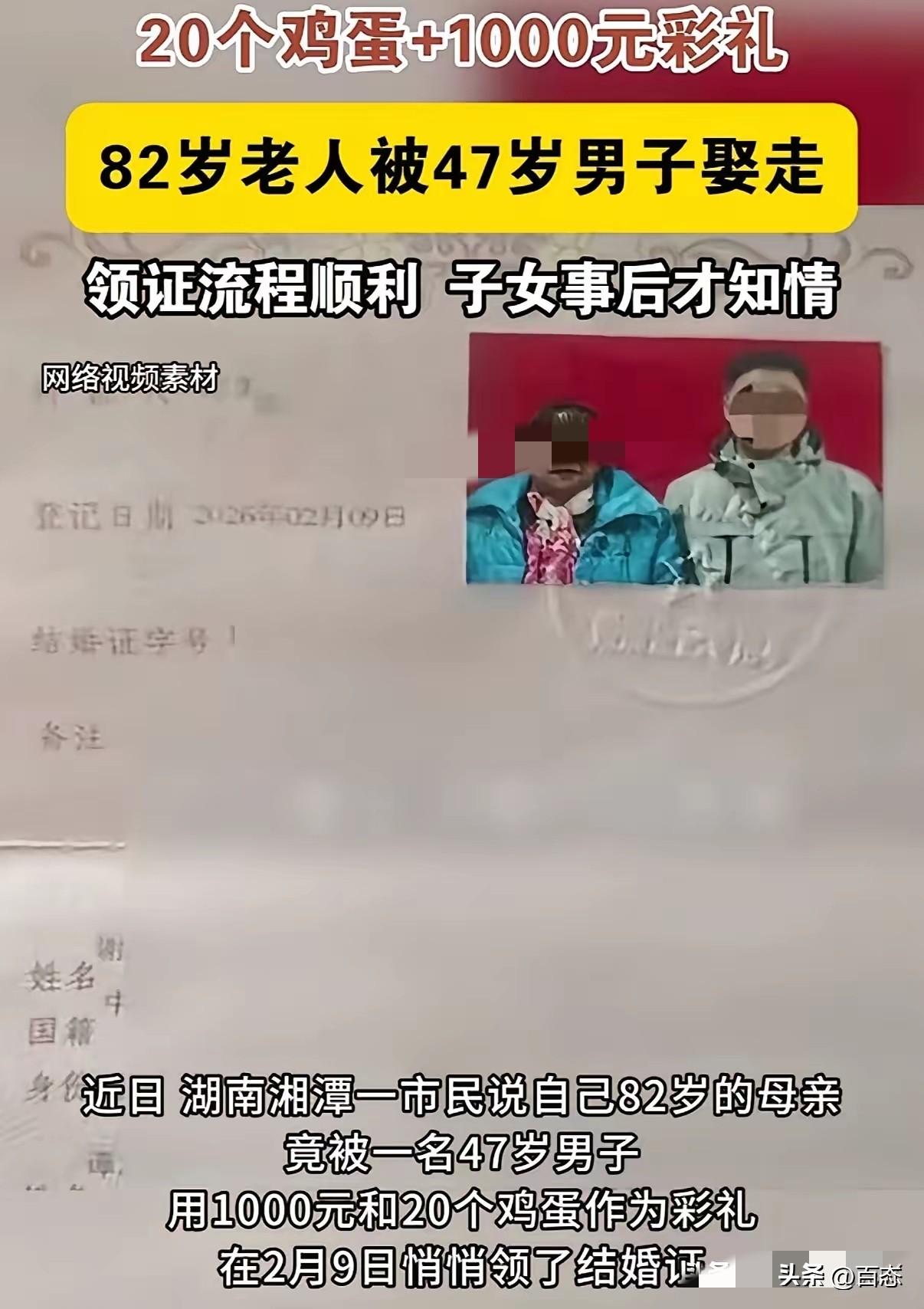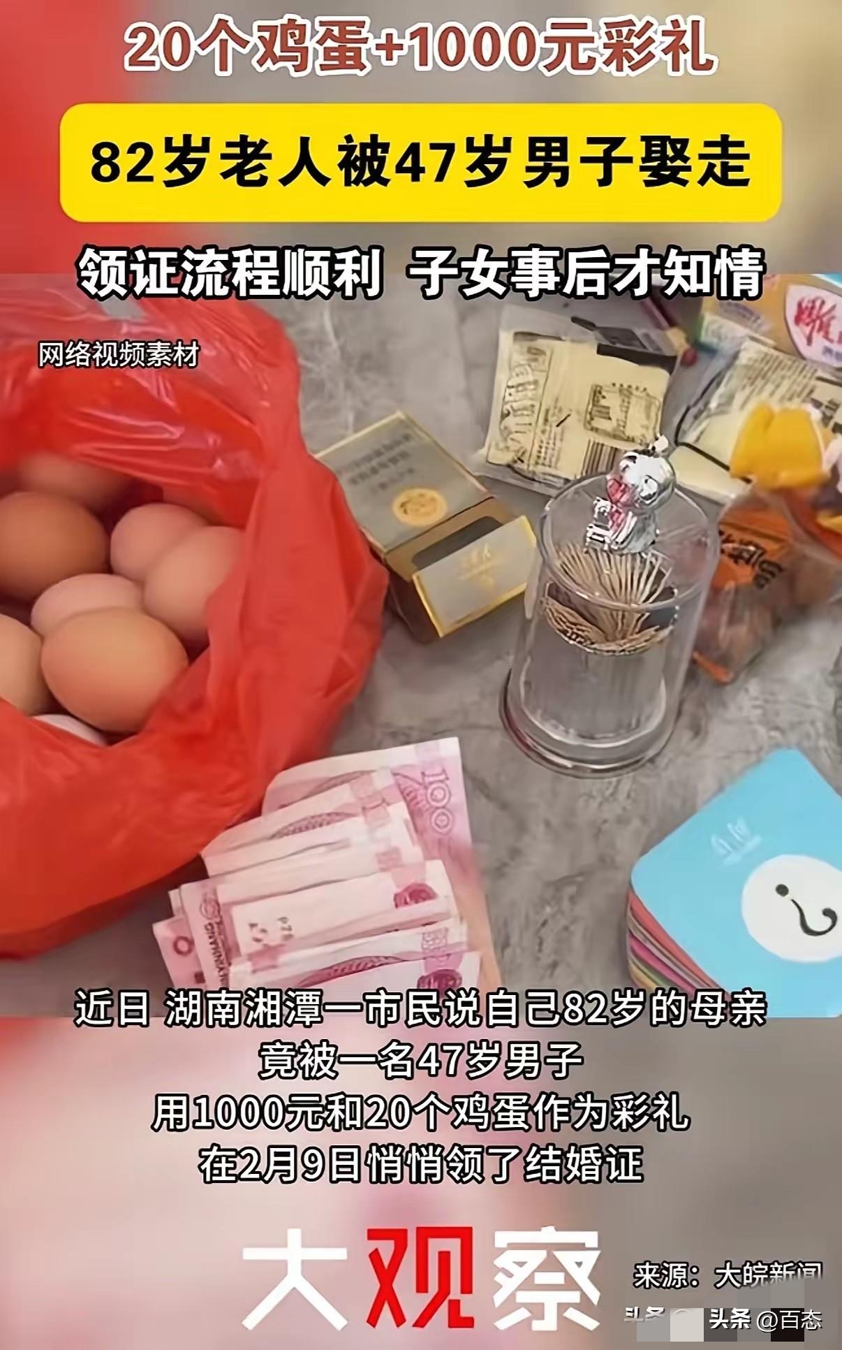 不敢相信,湘潭47岁的男子用20个鸡蛋和1000元彩礼,把82岁的老人娶回家。领完证后,子女才知情。 看到这如果我是82岁老人的子女,应该会同意这门婚事,至少有个伴,还有人照顾,这是好事。 希望男子不是一时冲动才娶这位老人的。 对此你们怎么看呢?