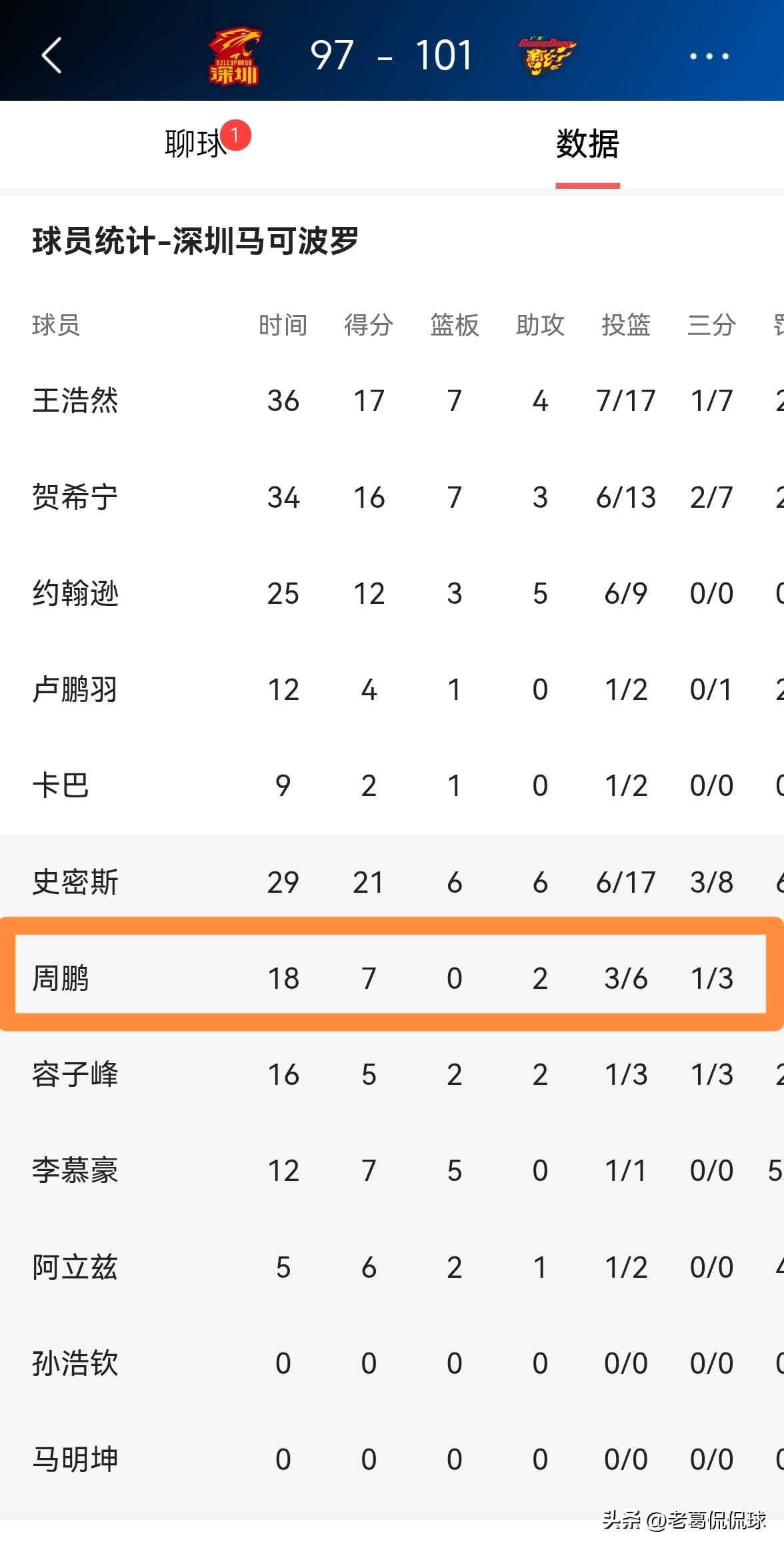深圳马可波罗老将周鹏真是倾其所有了!虽然今天深圳马可波罗在主场以97:101惜败于广东东阳光,但是老将周鹏面对旧主拼尽全力,真的是倾其所有。 全场比赛下来,周鹏替补出战18分钟,投篮6中3,其中三分球3中1得到7分2助攻,最终拼到5犯离场,他的场上正负值为+1。 作为一名36岁的老将,本场比赛周鹏的拼搏精神值得所有人的称赞,他在攻防两端都不遗余力。