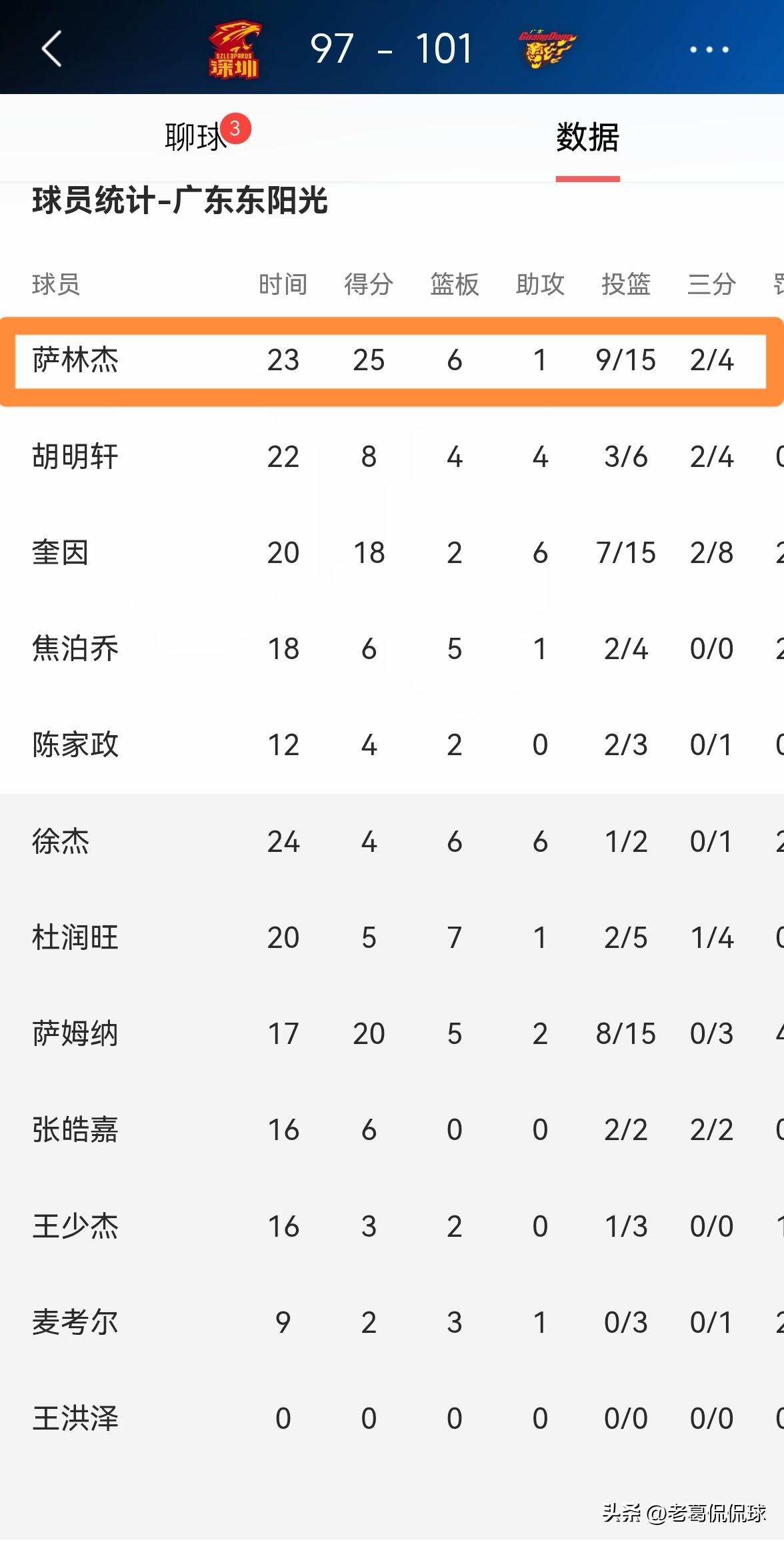 广东东阳光外援萨林杰真是功不可没!在今天广东东阳光客场以101:97力克深圳马可波罗的比赛中,萨林杰为球队的赢球立下了汗马功劳,称得上是球队获胜的大功臣。 整场比赛下来,萨林杰首发出战23分钟,投篮15中9,其中三分球4中2、罚球6中5非常高效的砍下25分,还有6篮板1抢断,他的场上正负值为+12。 实事求是的说,本场比赛萨林杰在攻防两端的表现都是无可挑剔的,尤其是在第四节比赛的关键时刻,萨林杰俨然成为了球队的定海神针。