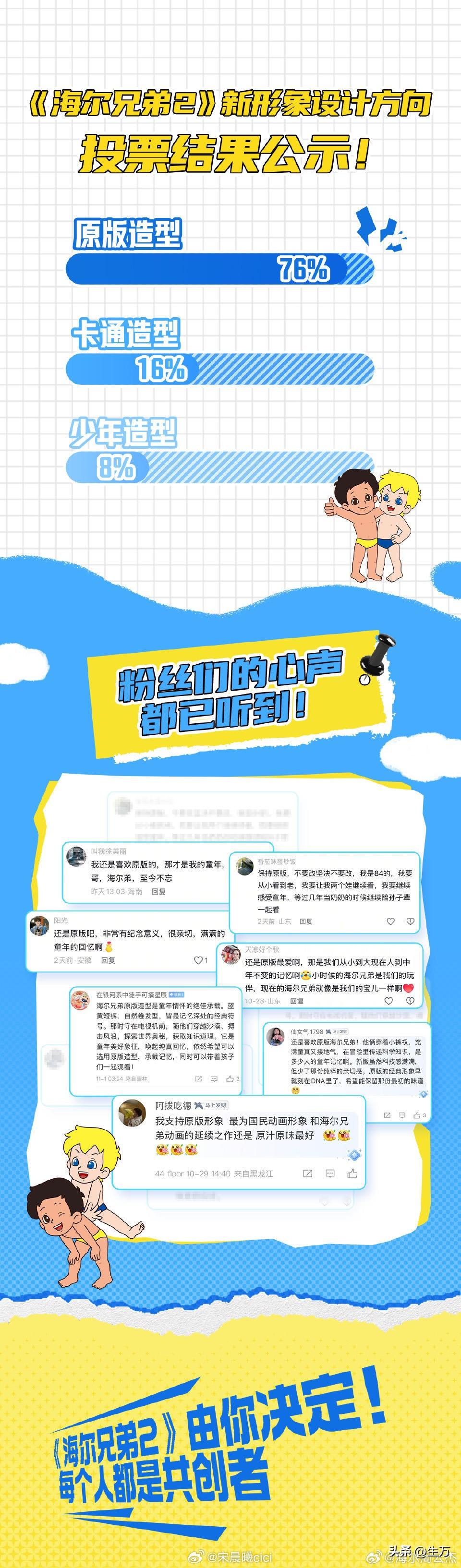 海尔兄弟2来了,超过76%的人支持原版造型! 今天晚上直播的时候,估计很多人被海尔兄弟在熟悉的音乐给唤醒了回忆,所以周云杰在公布线上海尔兄弟形象投票的时候,还是遵循了大家的意愿。 尤其是这两兄弟的造型,在这之前,其实周云杰也专门出过视频,意思就是有一部分人支持海尔兄弟长大一点点,毕竟已经过了这么多年了,而且还把这两个兄弟长大,10多岁的样子也弄出来了,可以说就是原来这两兄弟的放大版本。 但是没想到又过了两个月之后,经过大家在网上投票,居然有超过四分之三的人还是认为就用原版的造型和年龄,在叙事特征以及护士结构上和以前也是一样的,只是结合当下的科技发展和实时动态,还是用以前每一级给大家来一个科普的路子。 因为对于大多数八零后,少数九零后来说,这两兄弟冒险的场景实在是太多,给大家普及的知识穿越了几十年,所以大家并不想让他俩兄弟长大,就这样还是以前的样子就挺好的。 看来大家更多的是致敬曾经的自己,让这两兄弟继续用原来的样子,同时也跟上时代发展的方向,海尔团队已经制作了一部分原片出来,到时候我们看看前面几集讲的是什么。会不会有曾经熟悉的味道,我们拭目以待!