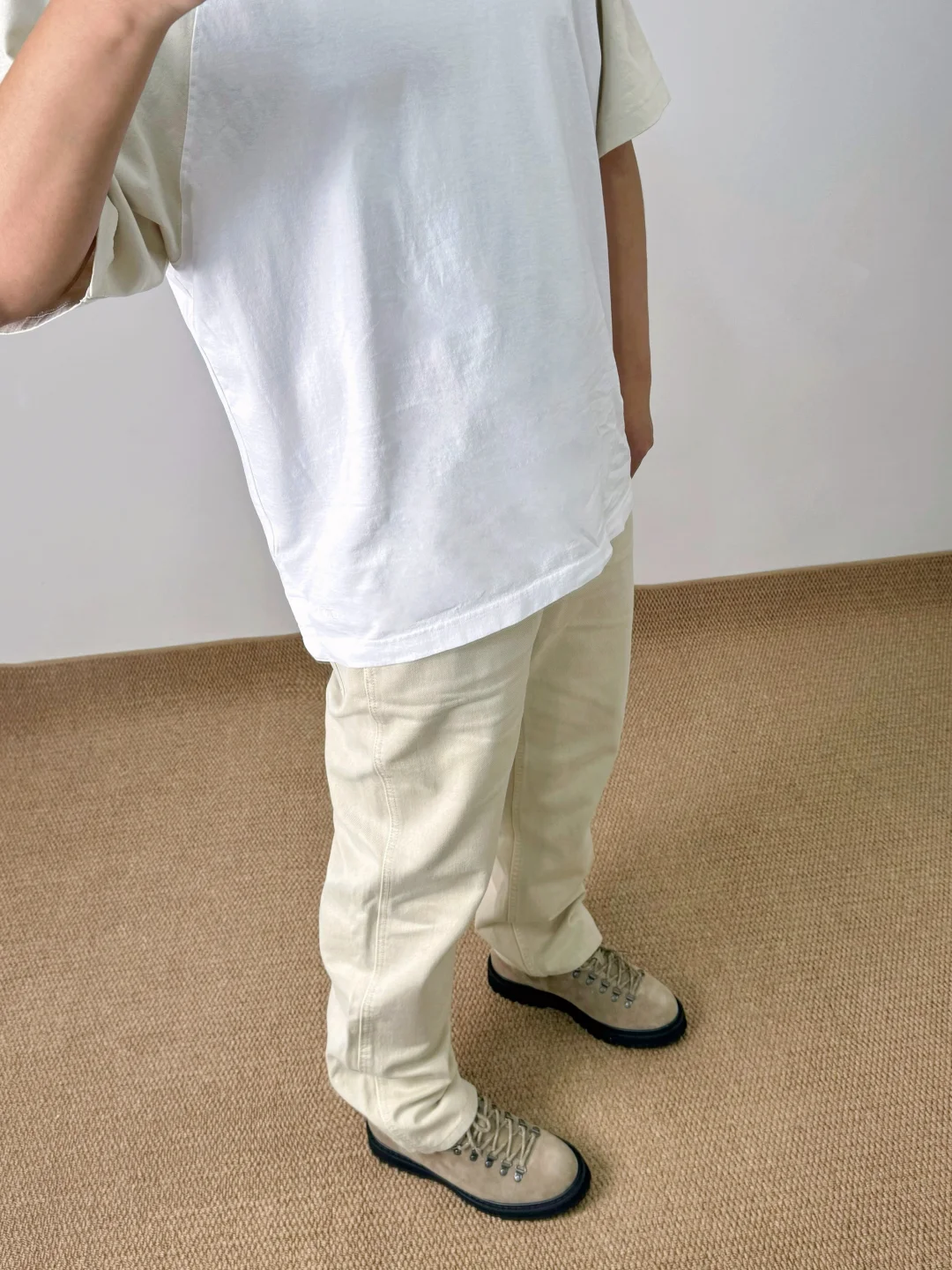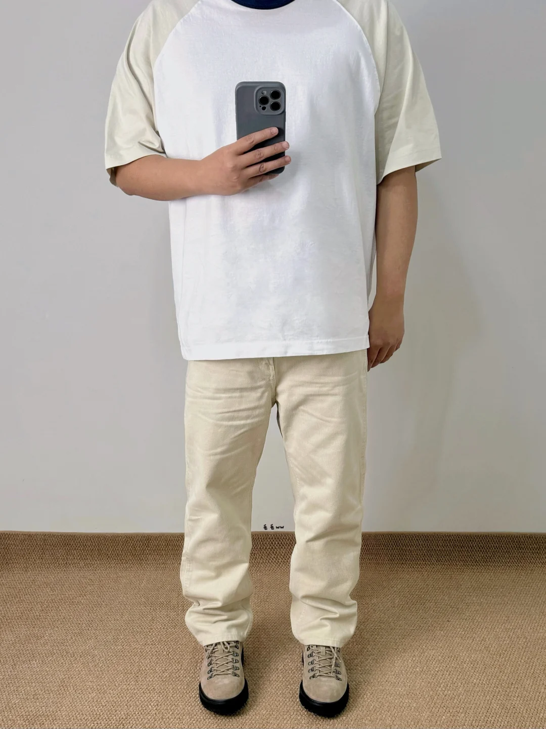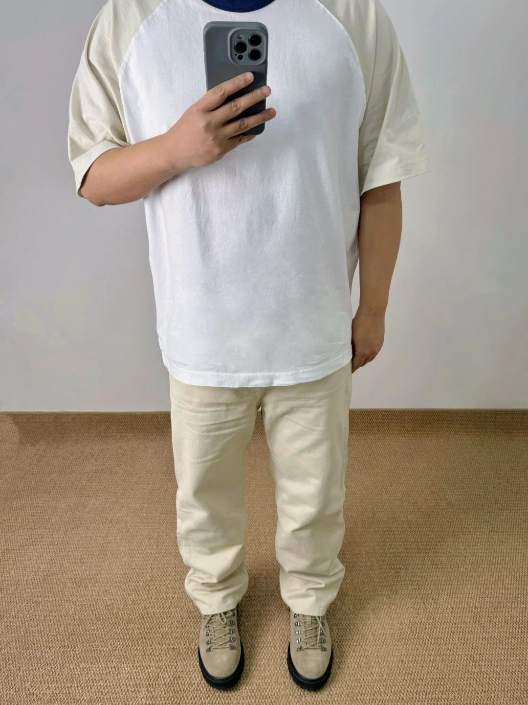 ☑️低饱和度浅米色,春夏搭配耐看的色系;拼色插肩袖、直筒牛仔裤、户外短靴,早八人一气呵成咯 . —————— . 👔Uniqlo JWA / 484203 // XL . 👖Uniqlo U / 482874 // 84A . 👟Massulti / 户外靴 // 42 . —————— . ✏️Taille:178cm 75kg // EU42 CHN265