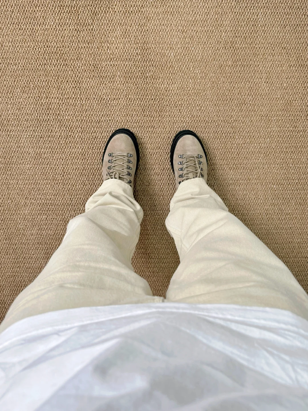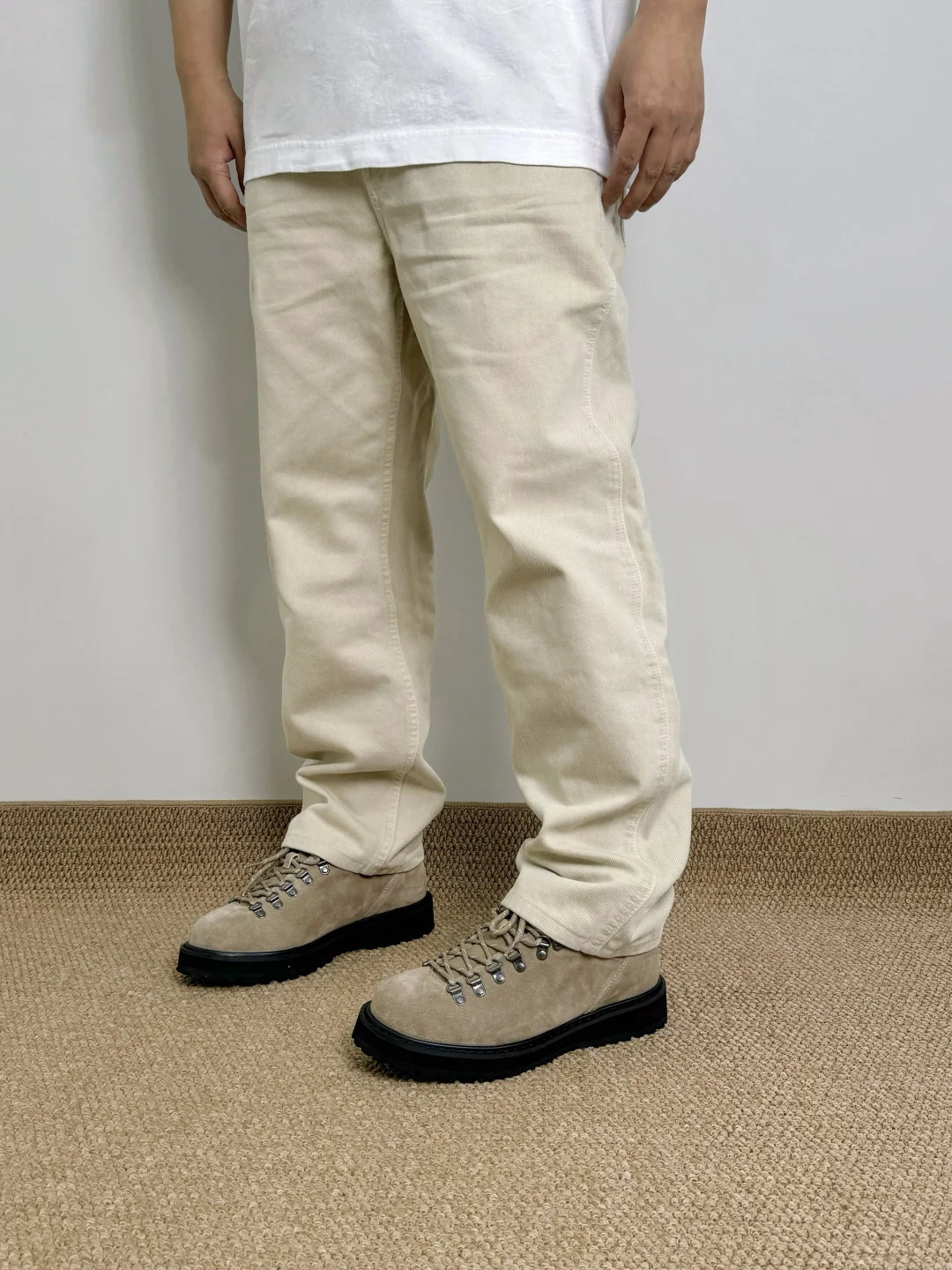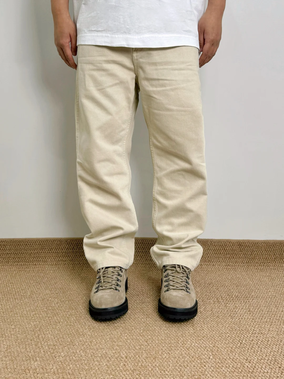☑️低饱和度浅米色,春夏搭配耐看的色系;拼色插肩袖、直筒牛仔裤、户外短靴,早八人一气呵成咯 . —————— . 👔Uniqlo JWA / 484203 // XL . 👖Uniqlo U / 482874 // 84A . 👟Massulti / 户外靴 // 42 . —————— . ✏️Taille:178cm 75kg // EU42 CHN265