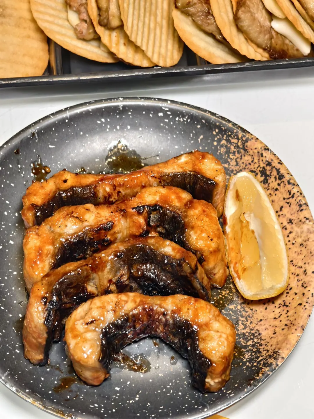 「肝脆薯了蒜了」是我们点的前菜,鹅肝+薯片这个组合太会了,一人一块刚好开胃🧄然后就是各种肉轮番上阵,原切谷饲黑安格斯牛肉品质真的稳,雪花纹理漂亮,烤完奶香四溢,入口即化🥩我们还点了半斤装巨无霸牛腩排,真的比脸还大,烤完剪开满满一盘,食肉兽吃到满足!